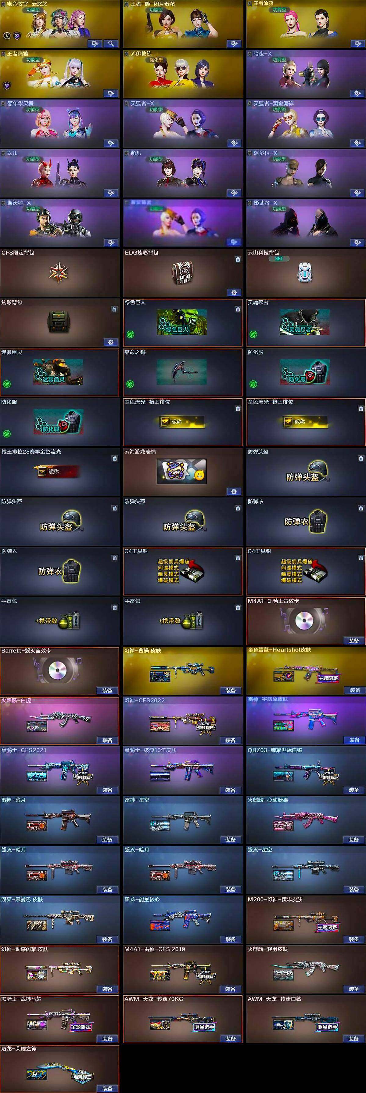 【皮肤】:M200-幻神-黄忠皮肤,幻神-CFS2022,幻神-动感闪耀 皮肤,幻神-曹操 皮肤,QBZ03-荣耀世冠白鲨,金色蔷薇-Heartshot皮肤,雷神-暗月,雷神-星空,M4A1-雷神-CFS 2019,雷神-宇航兔皮肤,火麒麟-轻羽皮肤,火麒麟-白虎,火麒麟-心动糖果,毁灭-暗月*2,毁灭-星空,毁灭-黑曼巴 皮肤,黑龙-能量核心,黑骑士-战神马超,黑骑士-CFS2021,黑骑士-破浪10年皮肤,AWM-天龙-传奇70KG,AWM-天龙-传奇白鲨,屠龙-荣耀之锋