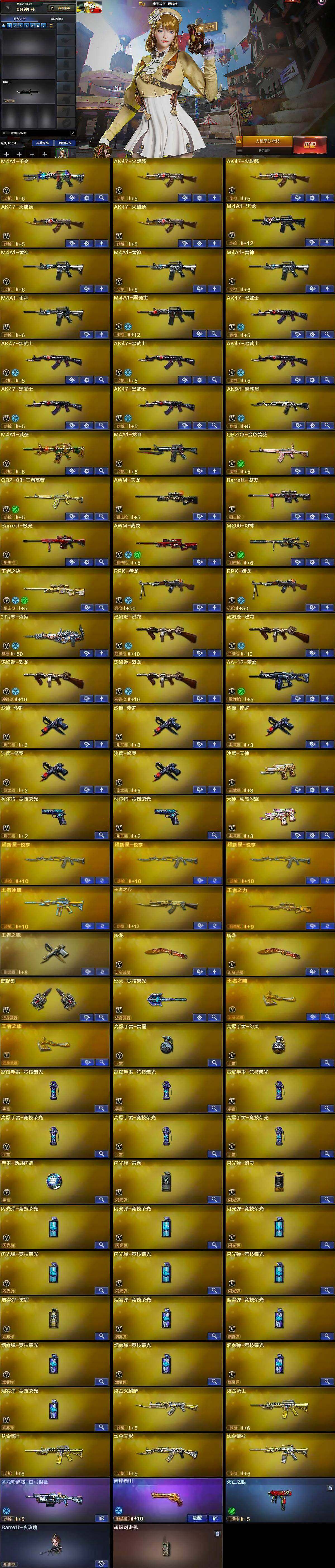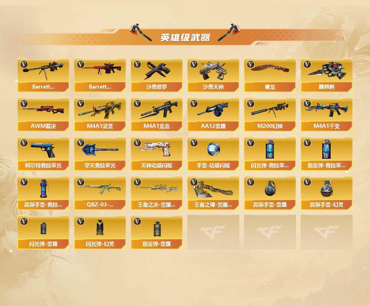 【英雄级武器】:M4A1-千变,AK47-火麒麟*4,M4A1-黑龙,M4A1-雷神*4,M4A1-黑骑士,AK47-黑武士*6,AN94-超新星,M4A1-武圣,M4A1-龙血,QBZ03-金色蔷薇,QBZ-03-王者蔷薇-觉醒版,AWM-天龙,Barrett-毁灭,Barrett-极光,AWM-裁决,M200-幻神,Barrett-金色蔷薇,王者之决-觉醒版,RPK-盘龙*2,加特林-炼狱,汤姆逊-烈龙*4,AA-12-雷霆,沙鹰-修罗*5,沙鹰-天神,柯尔特-竞技荣光*2,天神-动感闪耀,屠龙*2,麒麟刺,擎天-竞技荣光,王者之啸-觉醒版*2,高爆手雷-雷霆,高爆手雷-幻灵,高爆手雷-竞技荣光*6,手雷-动感闪耀,闪光弹-雷霆,闪光弹-幻灵,闪光弹-竞技荣光*6,烟雾弹-雷霆,烟雾弹-竞技荣光*6