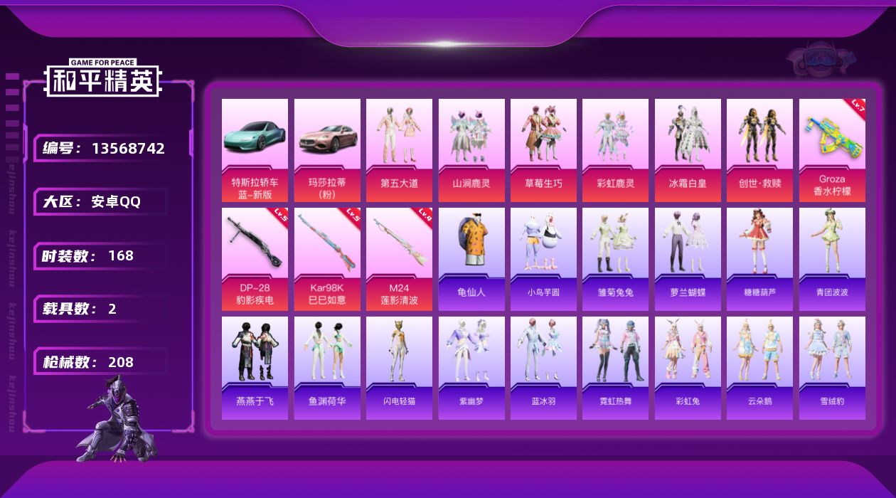 - [12042544]素材身法号【特价急出/详情看图】:安卓 手Q-1神装-13粉装-4特效枪-2载具-2粉色飞行器-9w热力值-18王牌印记-201套装-271枪皮【红色神装等级】:沙丘之主-图卡盟(二级)【热门品类】:粉装-雪国幻梦,粉装-梦幻火箭,套装-小丑鱼,套装-奇异狩猎者,套装-沙漠守护者,套装-暗夜行者,套装-龟仙人,套装-浪漫波比,小恶魔头饰【粉色载具】:特斯拉Roadster(沁心粉),幻影随行【粉色套装】:粉装-幻影战神,粉装-雪国幻梦,粉装-精灵迷巫,粉装-梦幻火箭,粉装-PEL轰鸣竞梦者,粉装-炙焰赤龙,粉装-飓风飞鹰,角色-初号机款机体服,粉装-焦糖拿铁,角色-复仇流浪者,粉装-心之回忆,粉装-飒粉甜心,角色-羊梦糖心【粉色枪皮等级】:M416-五爪金龙(七级),P90-沙丘之主(三级),Kar98K-巳巳如意(三级),DP-28-豹影疾电(五级)【粉色飞行器】:超新星飞行器,沙丘之主天马