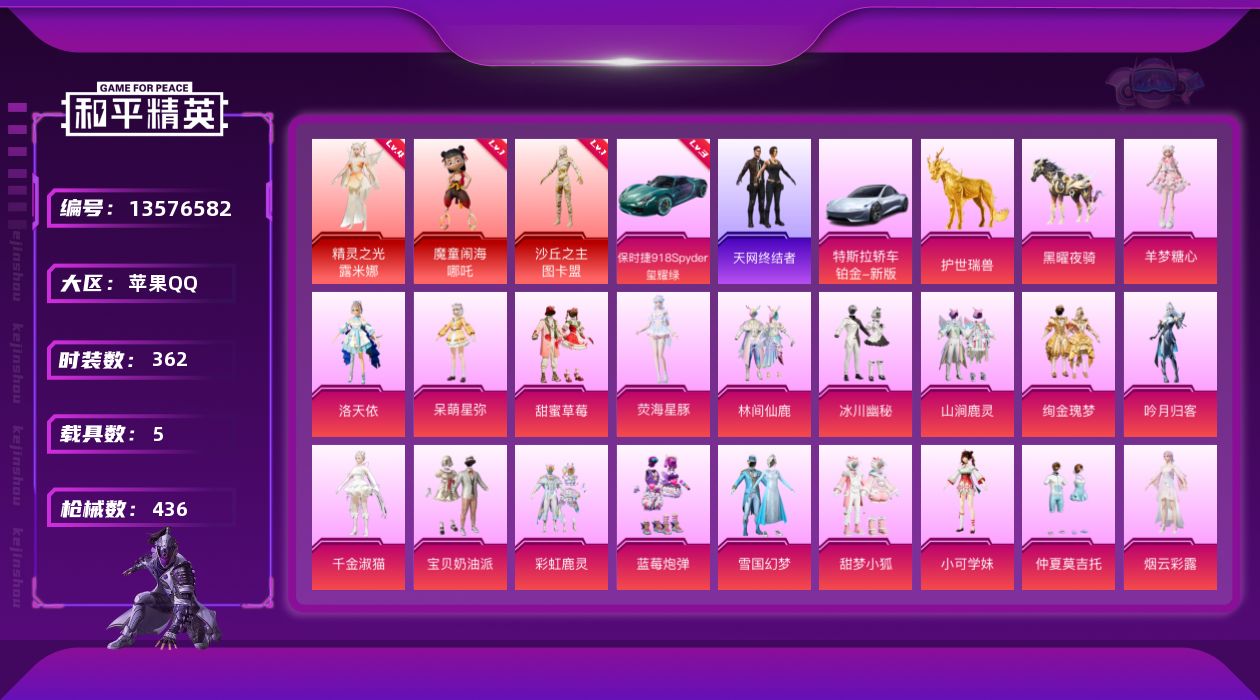 - PX_2095265- 可二次 苹果手Q-18王牌印记-5粉装-13特效枪-1载具-81894热力值-184套装-244枪皮-3卓越印记-1传奇印记, 【5粉装】,梦幻火箭,2号机款机体服,复仇流浪者,炙焰红王,幻影战神, 【13特效枪】,AKM-梦之光华-7级,SCAR-L-机甲封神-6级,M416-风花雪月-2级,M416-至情至圣-9级,M416-心之恋语-1级,GROZA-镜光银凌-5级,