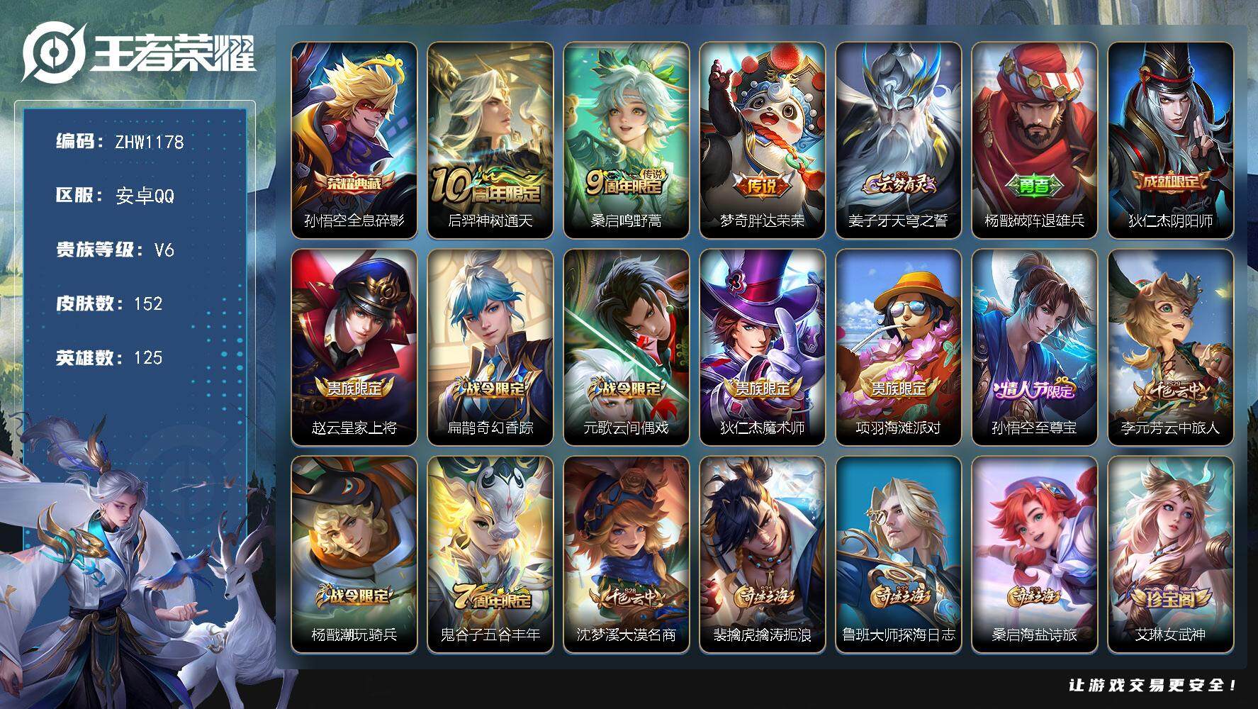 [13660887]【店主推荐捡漏号!可直接换绑】安卓Q-V6-最强王者段位-125英雄-152皮肤-1典藏-3传说-45史诗