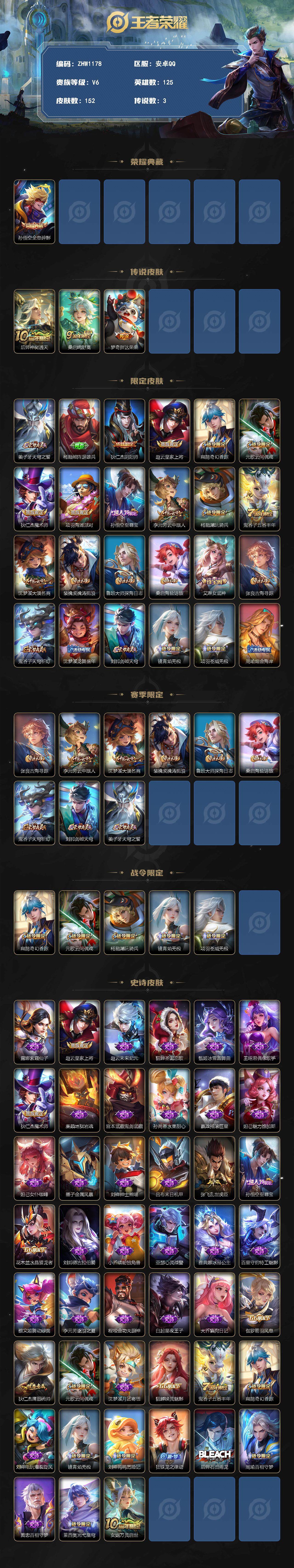 - [11321603]V10 15典藏 1珍品无双 6无双 3珍品传说 78传说 126英雄 582皮肤 典藏英雄武则天 女号 可修改实名 优质装备:馥梦繁花,天鹅之梦(小乔典藏),星空梦想(太空人),倪克斯神谕(宇宙婆娘),无限飓风号(高达),活力突击,杀手不太冷,大秦宣太后,鸣剑·曳影,全息碎影(猴子典藏),星域神启(倪克斯贼亮),九霄神辉(木兰典藏),赤影疾锋,弑枪猎影(韩信典藏),神器·明辉仪,青丘·九尾(妲己无双),碎月剑心(李白无双),神鉴启示录,小乔时之魔女(小乔无双),花合斗,离恨烟(公孙离无双),拾光映像(瑶典藏),江户川柯南,怪盗基德,朽木白哉,黄金狮子座,黄金射手座,云鹰飞将(小将军),绛天战甲(鸡嘴战神),黄金白羊座,猫影幻舞,久胜战神,炽阳神光,一念神魔,云霓雀翎,末日机甲-孙尚香(绿蚂蚱),地狱火,仲夏夜之梦(大飞蛾),音你心动-小乔,零号·赤焰,海洋之心,地狱之眼,飞鸢探春,胖达荣荣,李逍遥,乞巧织情,时之恋人-刘备(电焊工),游龙清影(小青龙),淬星耀世,超时空战士-狄仁杰,挚爱之约,挚爱花嫁,无双飞将,碎云,天秀幻梦,神器·狴犴令,神器·明辉仪,炽翼辉光(娃娃菜牛角包),浮生妄,青丘·九尾,百相守梦(张飞),追逃游戏(亚瑟),追逃游戏(安琪拉),电玩·雷克斯,鹤羽星尊,霜月吟,艾琳觅芳踪,琥珀纪元铠,琥珀纪元马超,金乌负日,朵莉亚心动手记,玄雷天君,涂山容容 传说皮:乘龙·问璇玑(孙尚香年限),乘龙·铭钟鼎(赵云年限),乘龙·淬吴钩(孙策年限),貂蝉曦玄引,吕布曦玄引,典韦战鼓燎原,落雪白狼,铠冥王哈迪斯,续相思,幻光神枪 珍宝阁皮:万物之道,优雅恋人,蔷薇恋人,玩趣恶龙 限定皮:愿照·九州拓(澜年限),愿照·福禄聚(蔡文姬年限),愿照·山河定(司空震年限),愿照·千秋盛(女娲年限),逐霄战戟,映山客,鸣野蒿,至尊宝,白虎志(电光耗子),凤求凰(白切鸡),凤凰于飞,太华(伽罗年限),武陵仙君(小桃花),异界灵契(白毛香),傲雪梅枪,补天,前尘镜,时之彼端,魔法小厨娘,白晶晶,时雨天司(水龙头),神威(电光马子),飞衡(韩信年限),玄嵩(庄周年限),瑞麟志(木兰年限),至美·乘鲤谣,遇见飞天,高山流水,五谷丰年,青龙志(铠年限),冰锋战神,幽恒(沐浴露),武圣,梁祝,逐梦之星,烈魂,天狼绘梦者,李小龙,逐梦之影,玄武志(苏烈年限),