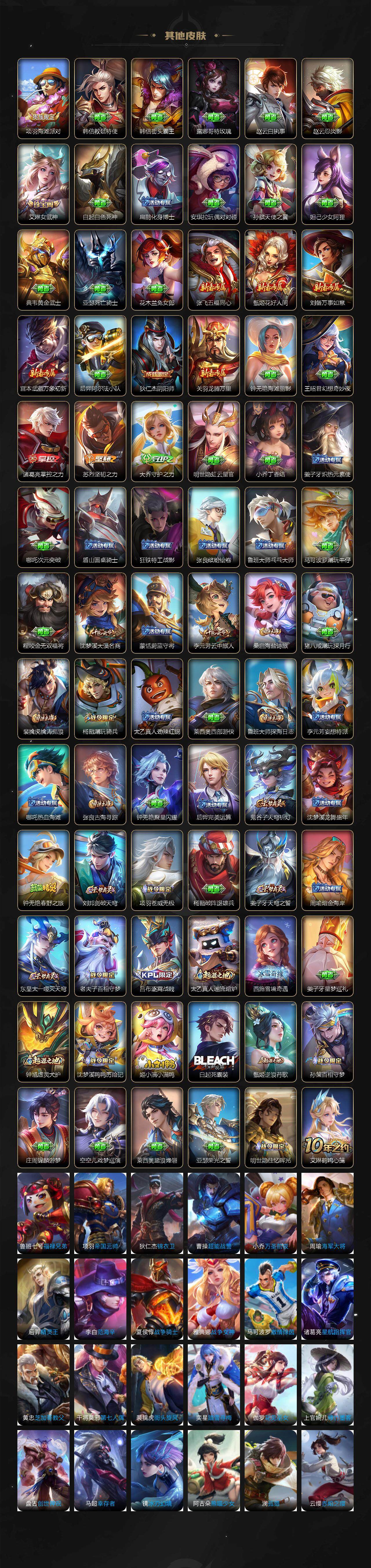 【其他皮肤】:项羽海滩派对,韩信教廷特使,韩信街头霸王,露娜哥特玫瑰,赵云白执事,赵云忍炎影,艾琳女武神,白起白色死神,扁鹊化身博士,安琪拉玩偶对对碰,孙膑天使之翼,妲己少女阿狸,典韦黄金武士,亚瑟死亡骑士,花木兰兔女郎,张飞五福同心,甄姬花好人间,刘备万事如意,宫本武藏万象初新,后羿阿尔法小队,狄仁杰阴阳师,关羽龙腾万里,钟无艳海滩丽影,王昭君幻想奇妙夜,诸葛亮掌控之力,苏烈坚韧之力,大乔守护之力,明世隐虹云星官,小乔丁香结,姜子牙炽热元素使,哪吒次元突破,盾山圆桌骑士,狂铁特工战影