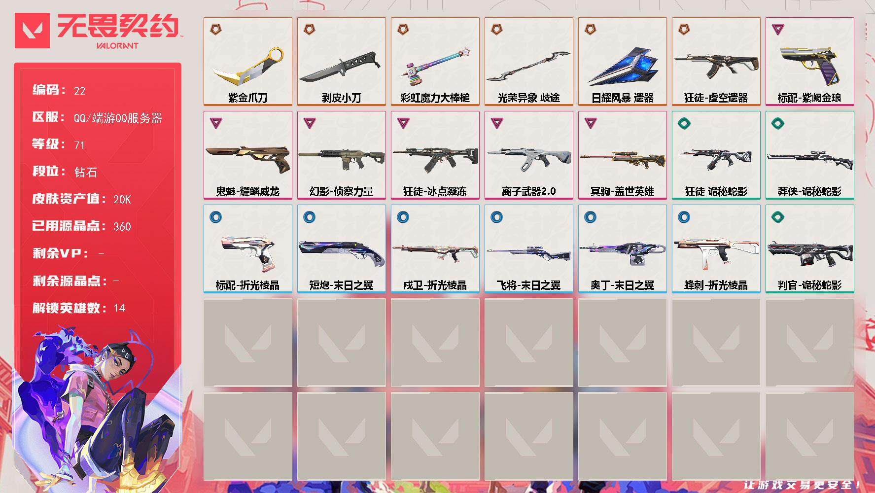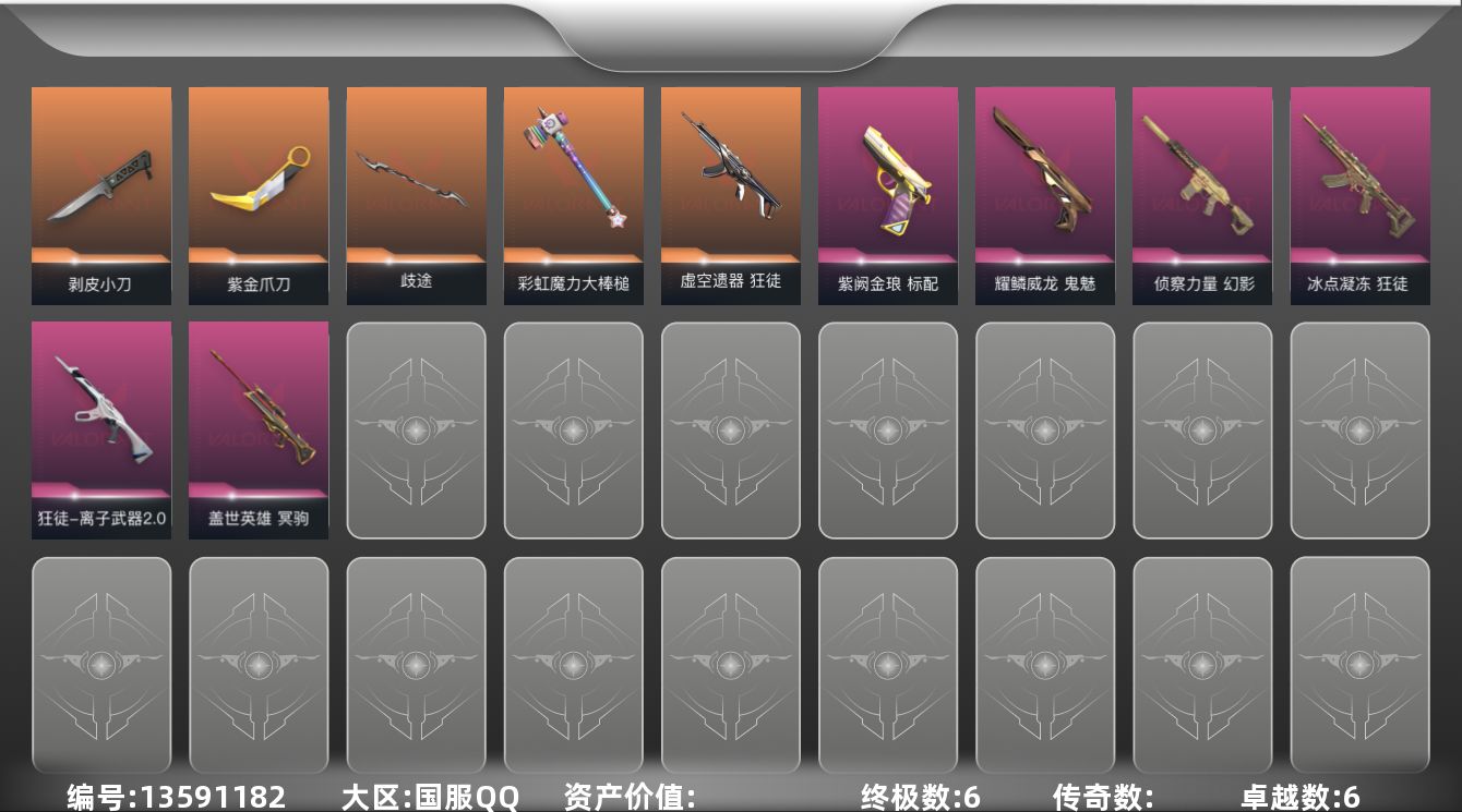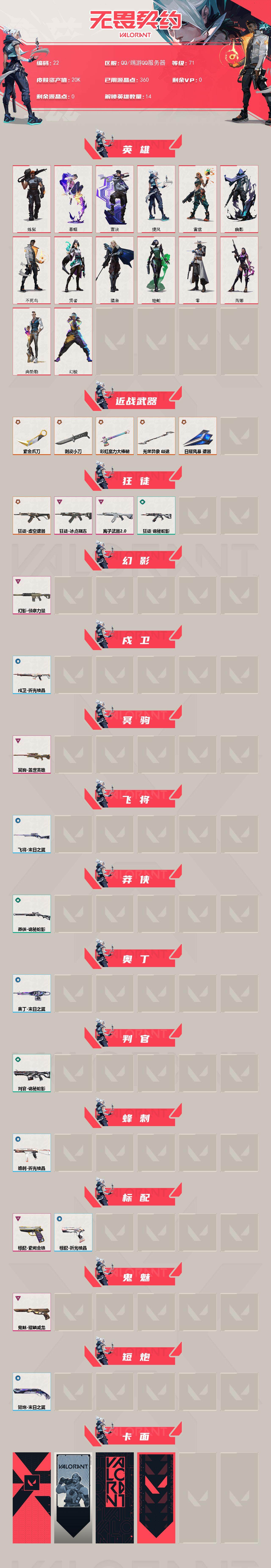 [13591182]【英雄】:幻棱,炼狱,暮蝶,壹决,捷风,雷兹,幽影,不死鸟,贤者,猎枭,蝰蛇,零,芮娜,尚勃勒 【近战 武器】:近战武器-光荣异象 歧途,近战武器-剥皮小刀,近战武器-紫金爪刀,近战武器-彩虹魔力大棒槌,近战武器-日耀风暴 遗器 【狂徒】:狂徒-虚空遗器,狂徒-冰点凝冻,狂徒-离子武器//2.0,狂徒-诡秘蛇影 【幻影】:幻影-侦察力量 【戍卫】:戍卫-折光棱晶 【冥驹】:冥驹-盖世英雄 【飞将】:飞将-末日之翼 【莽侠】:莽侠-诡秘蛇影 【奥丁】:奥丁-末日之翼 【判官】:判官-诡秘蛇影 【蜂刺】:蜂刺-折光棱晶 【标配】:标配-紫阙金琅,标配-折光棱晶 【鬼魅】:鬼魅-耀鳞威龙 【短炮】:短炮-末日之翼 【卡面】:代号红色 卡面,新兵报到 卡面,V契约 卡面,无畏契约 卡面 【喷漆】:胜利属于无畏契约 喷漆,GLHF 喷漆,无畏契约 喷漆 【挂饰】:V25第三幕:超凡 挂饰,无畏契约 纪念币 挂饰