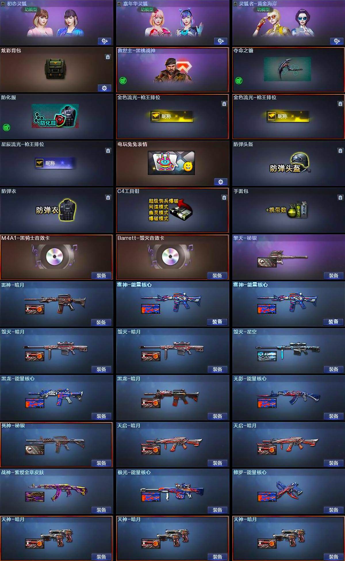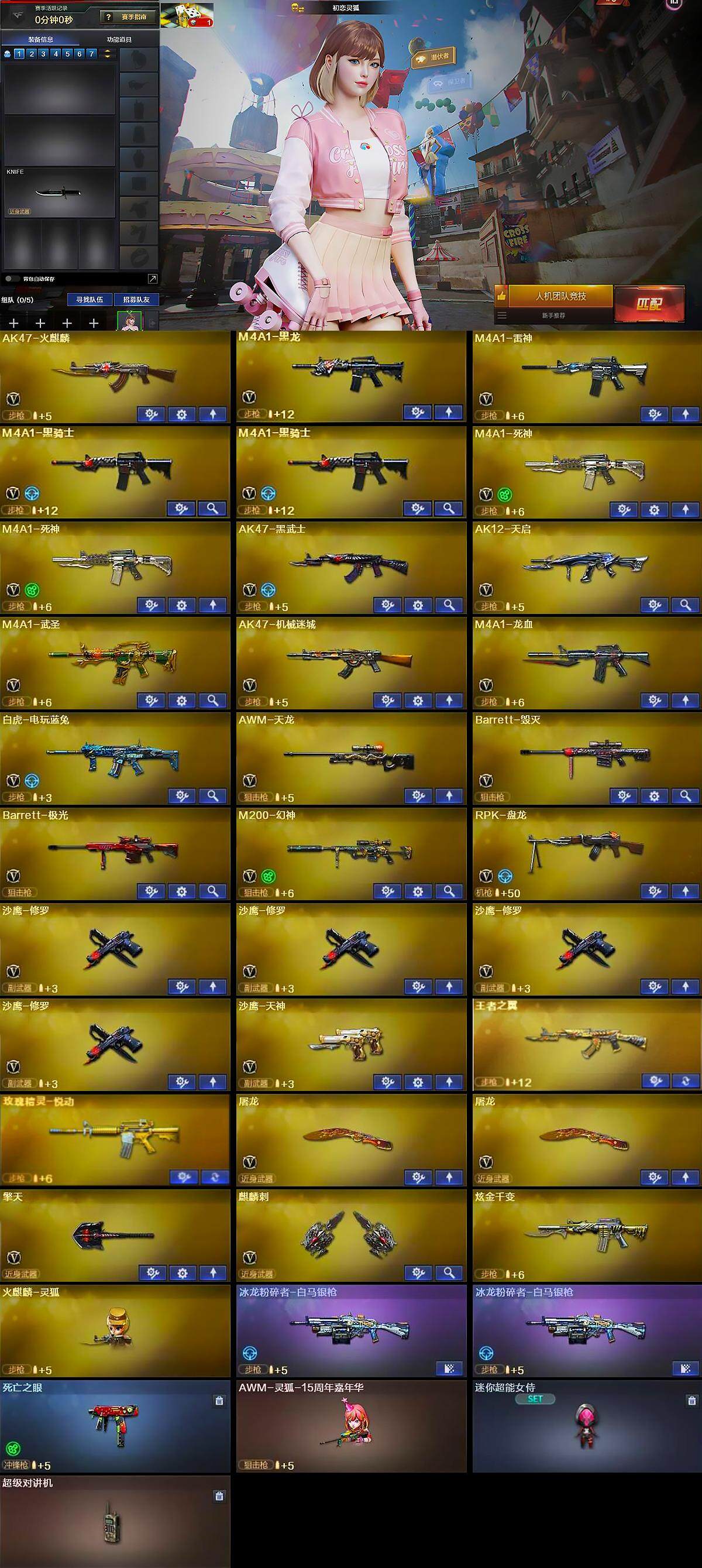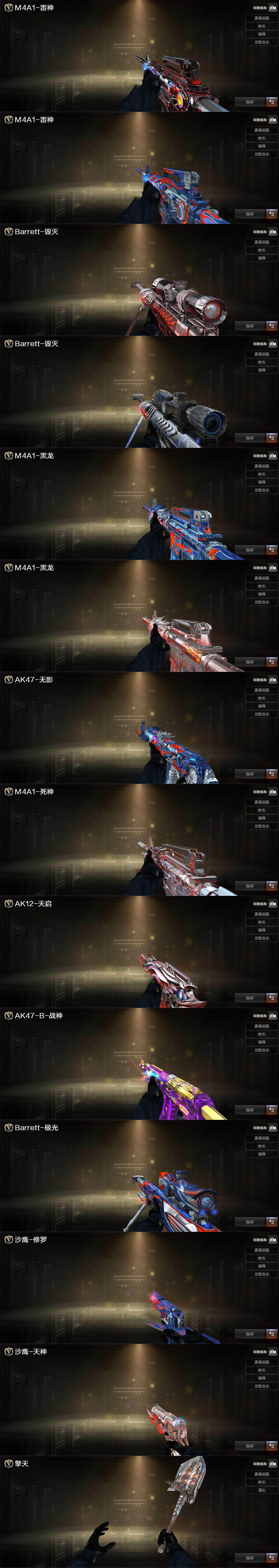 【英雄级武器】:AK47-火麒麟,M4A1-黑龙,M4A1-雷神,M4A1-黑骑士*2,M4A1-死神*2,AK47-黑武士,AK12-天启,M4A1-武圣,AK47-机械迷城,M4A1-龙血,白虎-电玩蓝兔,AWM-天龙,Barrett-毁灭,Barrett-极光,M200-幻神,RPK-盘龙,沙鹰-修罗*4,沙鹰-天神,屠龙*2,擎天,麒麟刺