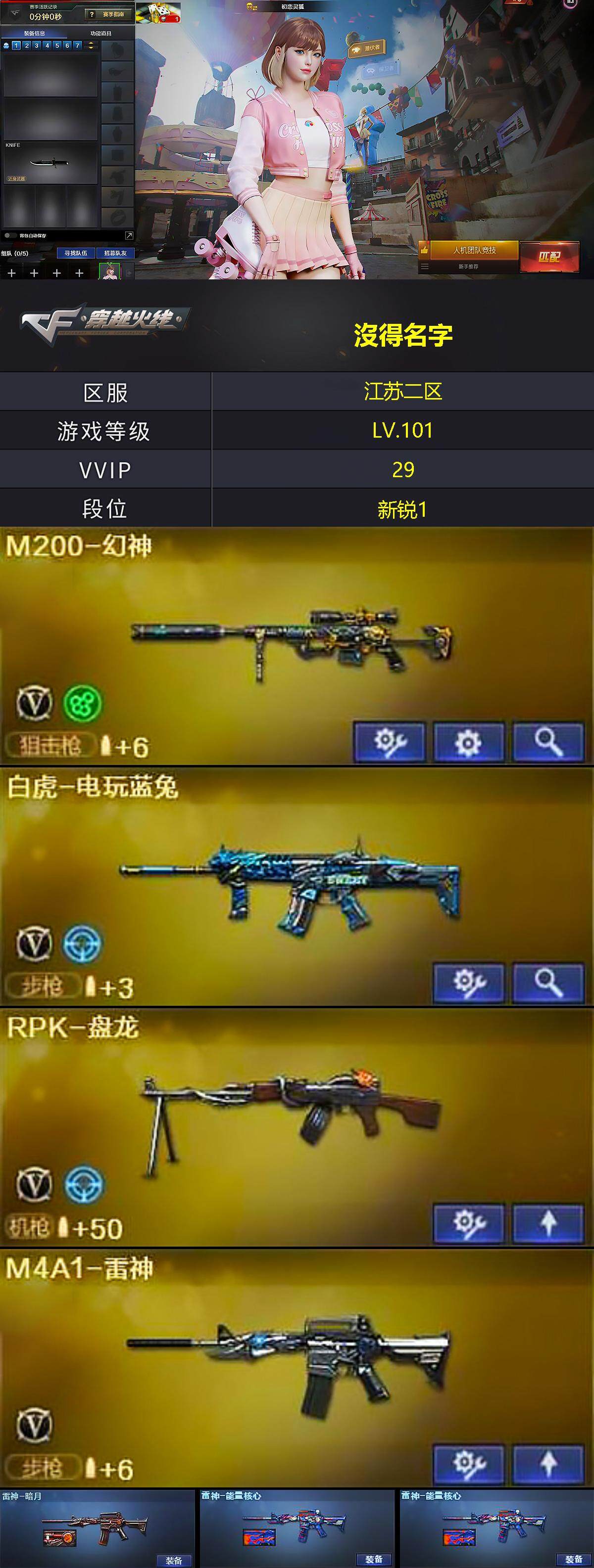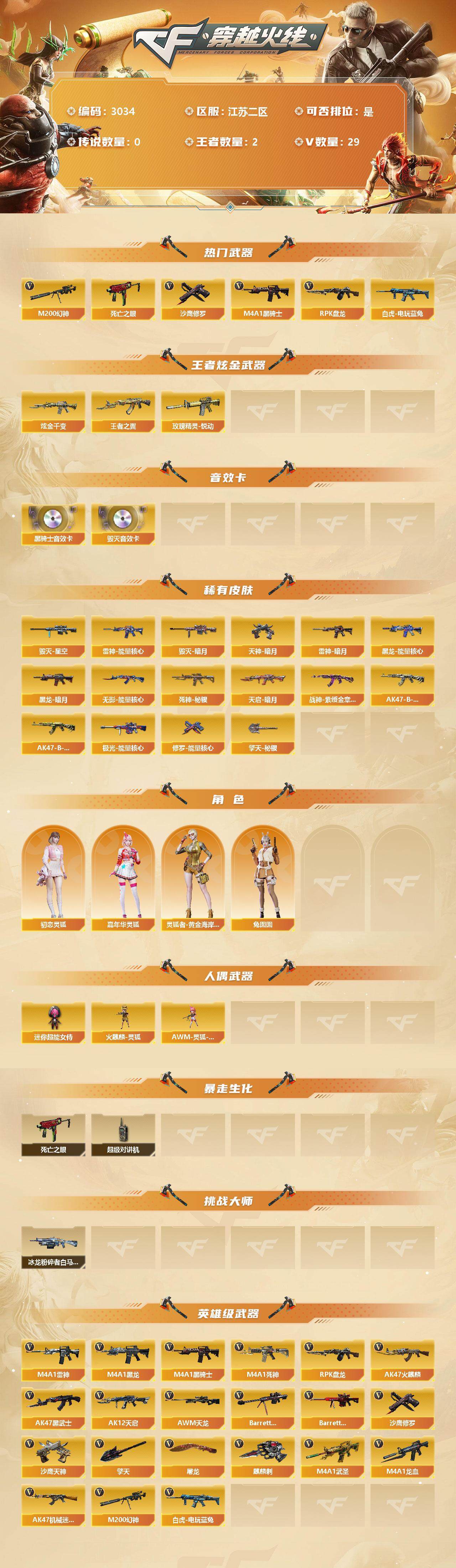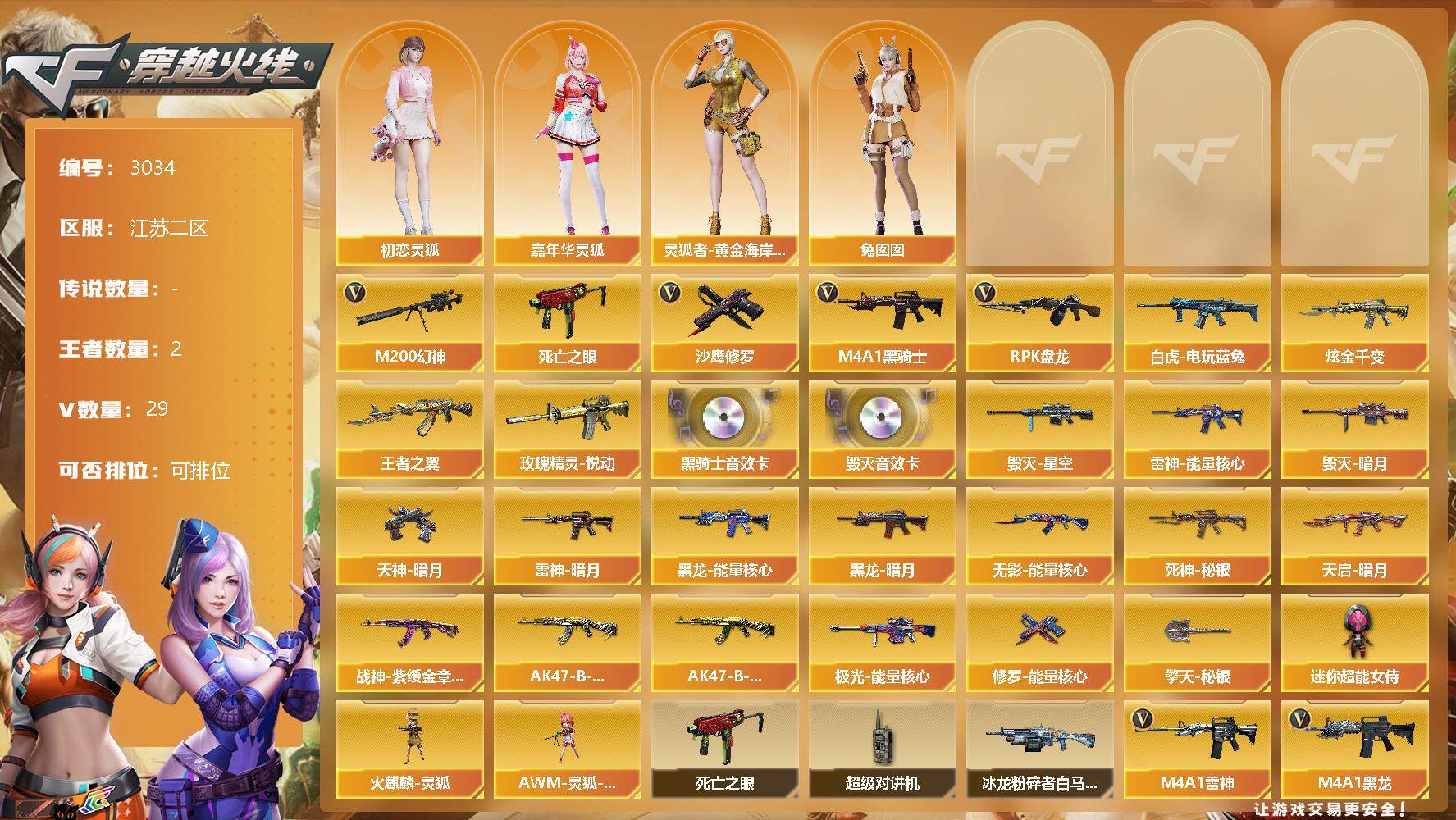 [13444841]江苏二区-29V-2王者-1炫金 【热门武器】:M200-幻神,死亡之眼,白虎-电玩蓝兔,M4A1-黑骑士*2,RPK-盘龙,沙鹰-修罗*4 【王者炫金武器】:王者之翼,玫瑰精灵-悦动,炫金千变 【音效卡】:M4A1-黑骑士音效卡,Barrett-毁灭音效卡 【皮肤】:雷神-暗月,雷神-能量核心*2,毁灭-暗月*2,毁灭-星空,黑龙-能量核心,黑龙-暗月,无影-能量核心,死神-秘银,天启-暗月*2,战神-紫绶金章皮肤,AK47-B-常胜将军-刘备,AK47-B-常胜将军-孙权*2,极光-能量核心,修罗-能量核心,天神-暗月*3,擎天-秘银 【角色】:初恋灵狐,嘉年华灵狐,灵狐者-黄金海岸,兔囡囡 【人偶武器】:火麒麟-灵狐,AWM-灵狐-15周年嘉年华,迷你超能女侍 【暴走生化】:死亡之眼,超级对讲机 【挑战大师】:冰龙粉碎者-白马银枪*2 【英雄级武器】:AK47-火麒麟,M4A1-黑龙,M4A1-雷神,M4A1-黑骑士*2,M4A1-死神*2,AK47-黑武士,AK12-天启,M4A1-武圣,AK47-机械迷城,M4A1-龙血,白虎-电玩蓝兔,AWM-天龙,Barrett-毁灭,Barrett-极光,M200-幻神,RPK-盘龙,沙鹰-修罗*4,沙鹰-天神,屠龙*2,擎天,麒麟刺 【道具】:炫彩背包,救世主-黑桃战神,夺命之镰,防化服,金色流光-枪王排位*2,星辰流光-枪王排位,电玩兔兔表情,防弹头盔,防弹衣,C4工具钳,手雷包 【特殊枪械】:2黑骑士,1盘龙