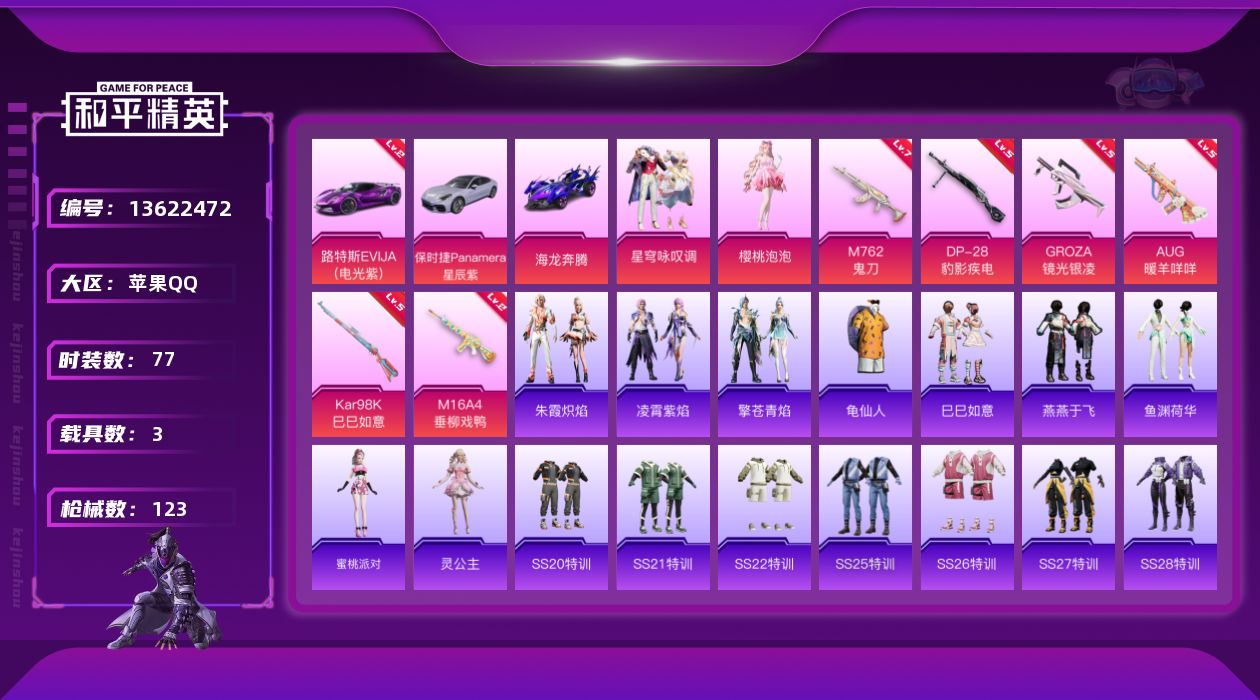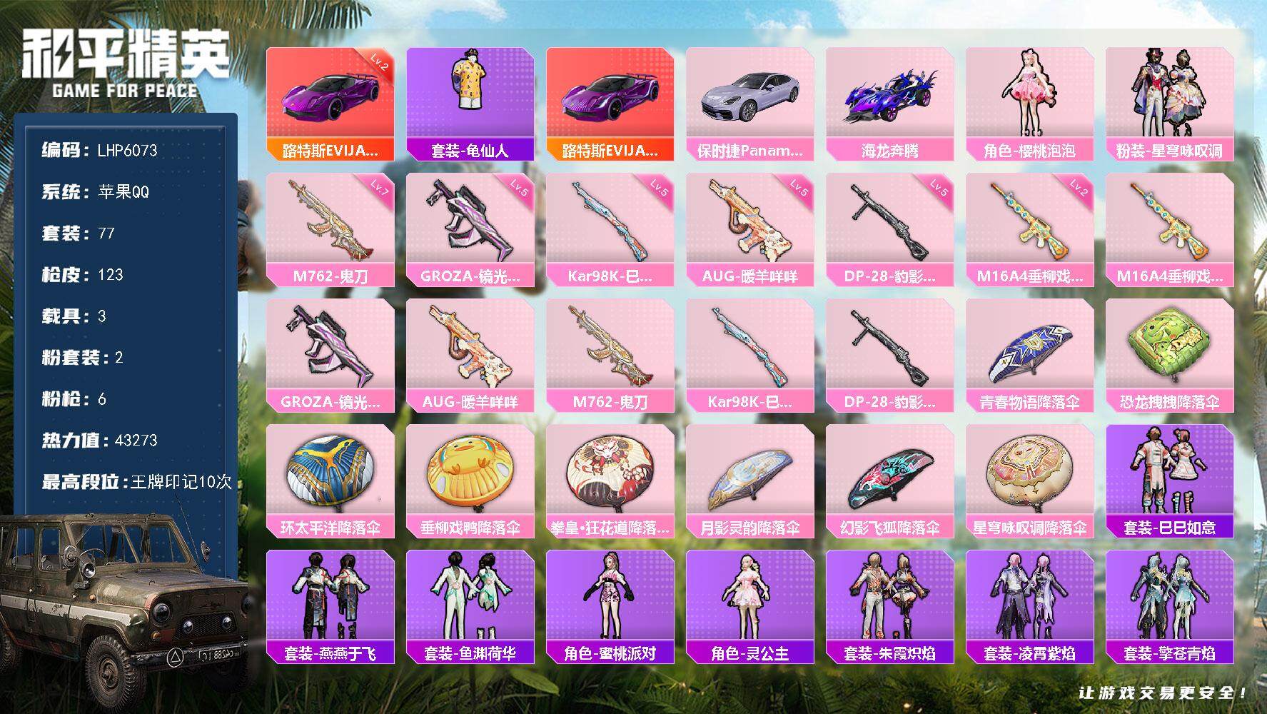 [13622472]【店主推荐捡漏号!可直接换绑】/地铁满天赋 苹果 手Q-2粉装-6特效枪-3载具-4.3w热力值-10王牌印记-77套装-123枪皮【红色载具】:路特斯EVIJA(电光紫)(二级)【热门品类】:套装-龟仙人【粉色载具】:路特斯EVIJA(电光紫),保时捷Panamera(星辰紫),海龙奔腾【粉色套装】:角色-樱桃泡泡,粉装-星穹咏叹调【粉色枪皮等级】:M16A4-垂柳戏鸭(二级),GROZA-镜光银凌(五级),AUG-暖羊咩咩(五级),M762-鬼刀(七级),Kar98K-巳巳如意(五级),DP-28-豹影疾电(五级)