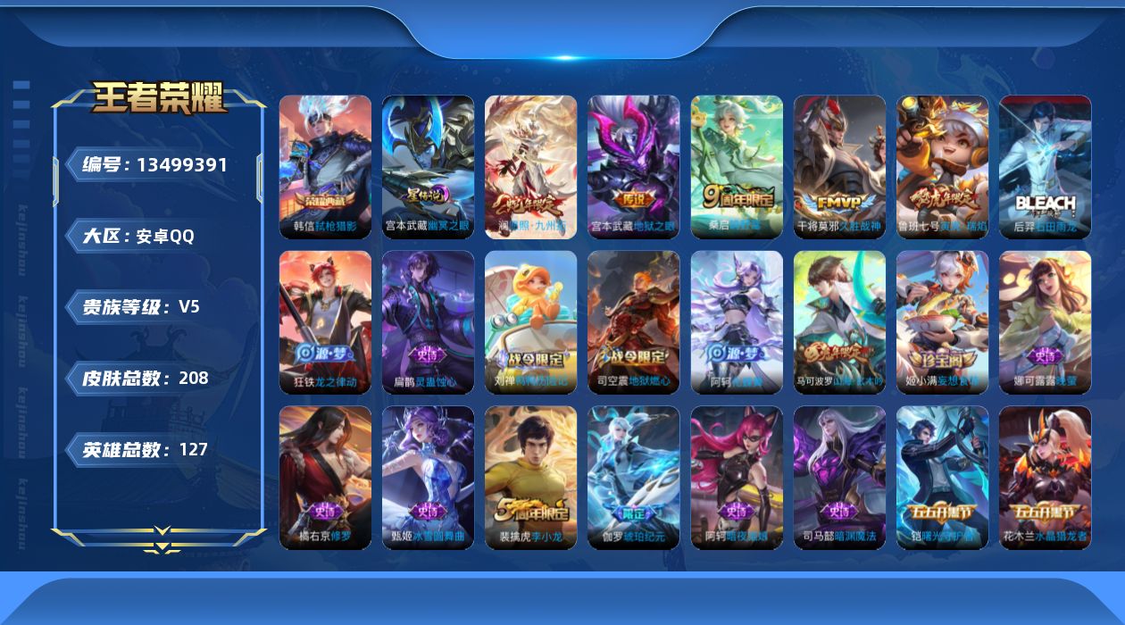 [13499391]可二次【店主推荐捡漏号!可直接换绑】,安卓Q-V5-永恒钻石III段位-127英雄-208皮肤-1典藏-0珍品无双-0无双-0珍品传说-5传说-58史诗