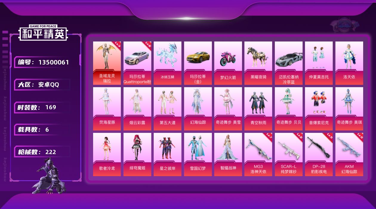 - [12112848]3粉装 8特效枪 3载具 14印记 可二次 可修改实名 优质装备:合金龙骨(蓝),特斯拉Roadster(水滴蓝),特斯拉Roadster(沁心粉),MG3洛神天依,M416心之恋语,梦幻火箭(新101)(新火箭少女101粉色套装),AKM梦之光华,七级M416-心之恋语,GROZA-镜光银凌,月影灵韵,AUG-暖羊咩咩,蜜獾-荧海星豚,绯穹魔姬,Kar98K-巳巳如意 热门装扮:呆萌铁蟹,深海小丑鱼 稀有枪皮:DP-28-豹影疾电 五级特效枪:五级GROZA-镜光银凌,五级Kar98K-巳巳如意,五级DP-28-豹影疾电,五级AUG-暖羊咩咩,五级AKM-梦之光华 四级特效枪:四级蜜獾-荧海星豚 三级特效枪:三级MG3-洛神天依 紫色装扮:幻彩翩翩,SS23特训,妙红点点,SS30特训套装,SS31特训套装,云朵鹅,彩虹兔,雪绒豹,SS33特训套装,青涩时光,SS21特训,莱茵河畔,白兰地假日,顶瓜瓜,冷焰舞者,吉莉礼服,夏日音浪,夜莺强袭者,完美偶像,帅气教官,幻世战舞者,幻影武者,冰川特警,萌趣咩咩,人气偶像,六六大吉,娇憨猪猪,时空追击者,暴风机械师,SS16特训,瑞龙福将,团圆交子,SS17特训,治愈之星,科技之星,SS14特训,萌趣颜团子,梦起落英,青春冒险家,潮流游乐家,SS15特训,SS20特训,SS18特训,飞驰魅影,音速流光,SS19特训,黄色名流,青年教官,风暴特警,骑行爱好者,魅力单车,鹤鸣,麻辣教官,黄色伏地魔,黄色运动,黑色伏地魔,龙的传人,龟仙人,龙魂突击队,蝶变,霓虹街区,酷潮明星,都市漫游者,都市魅力,酒红色名流,野性战心,长空猛禽,街头潮人,深蓝色名流,湖蓝色名流,滨海假日,滨海厨神,灼焰舞者,炫蓝之夏,牛气冲天,牛气满满,海岛探路者,战地督导,探宝勇士,极地朋克,极速红龙,柠萌假日,格斗先锋,橘黑制服,沙漠兵团,沙漠毒蛇,竞技达人朋克,红色运动,绮丽涂鸦,缤纷果语,耀眼新星,荣耀,蓝彩潮人,蓝色运动,竞技勇士朋克,猎鹰,猛禽,王牌教练,甜蜜熊情侣,空岛之星,疯狂小兔子,白色伏地魔,破晓战魂,破蛋小黄鸡,福星高照,SS29特训,粉日山川,SS28特训,鱼渊荷华,玉兔迎春,燕燕于飞,巳巳如意,智谋强哥,异域银装,竞技名士,绒宝小鹅,果汁能量,惊鸿侠骨,SS24特训(SS24特训套装),SS25特训,锦衣飞扬,金羽特工,SS27特