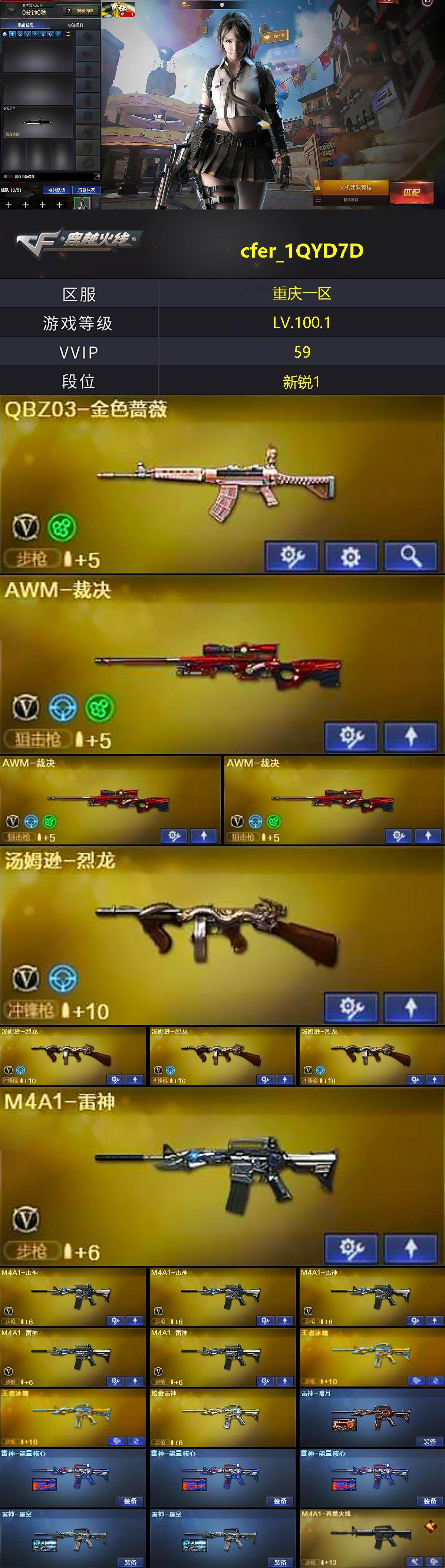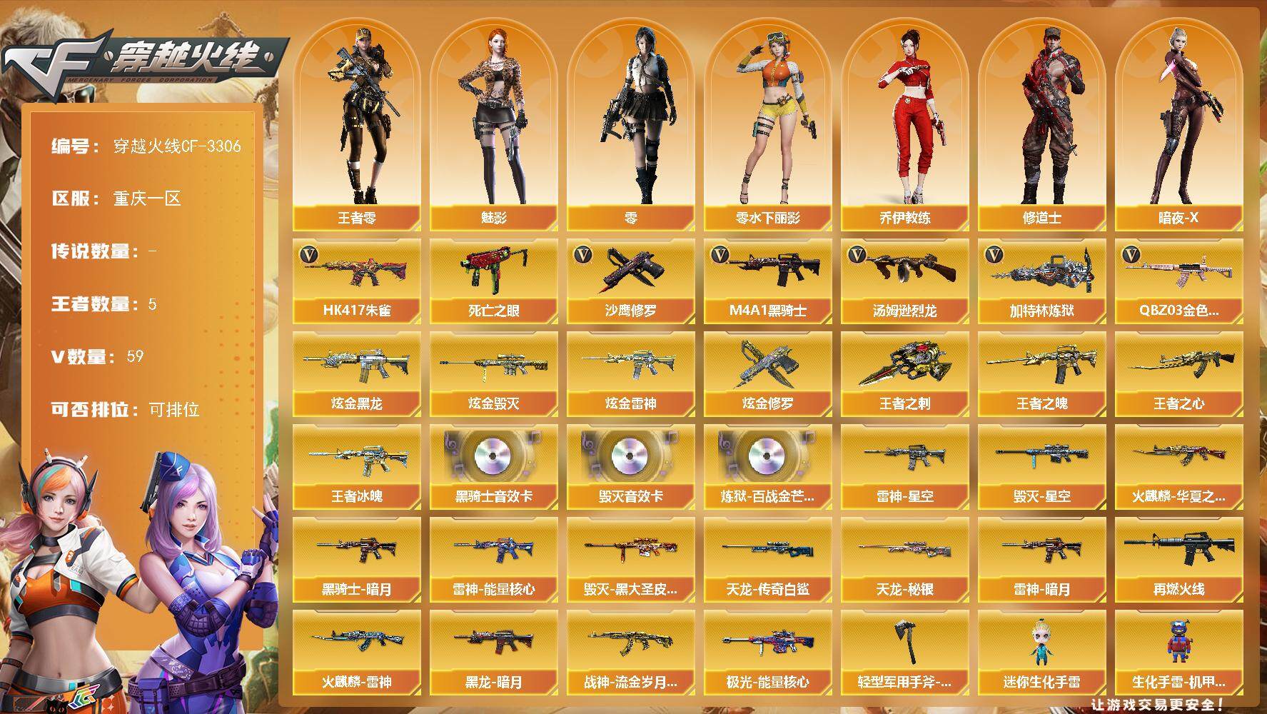 [13625912]重庆一区-59V-5王者-4炫金 【热门武器】:QBZ03-金色蔷薇,HK417-朱雀,死亡之眼,M4A1-黑骑士,汤姆逊-烈龙*4,加特林-炼狱*2,沙鹰-修罗 【王者炫金武器】:王者冰魄,王者之魄,王者之心,王者之刺,炫金黑龙,炫金雷神,炫金毁灭,炫金修罗 【音效卡】:M4A1-黑骑士音效卡,Barrett-毁灭音效卡,炼狱-百战金芒-庆典舞曲音效卡 【皮肤】:雷神-暗月,雷神-能量核心*3,雷神-星空*2,M4A1-再燃火线,火麒麟-雷神,火麒麟-华夏之心,毁灭-星空,毁灭-黑大圣皮肤,黑龙-暗月*2,黑骑士-暗月,战神-流金岁月皮肤,天龙-秘银,AWM-天龙-传奇白鲨,极光-能量核心,轻型军用手斧-再燃火线 【角色】:零,魅影,王者-零,乔伊教练,修道士,暗夜-X,北极狐-X,初恋灵狐,风暴女,零-水下丽影,灵狐者-X,龙儿,潘多拉-X,雪莉杨,影武者-X 【人偶武器】:迷你生化手雷*2,生化手雷-机甲核心,闪光弹-小乔 【暴走生化】:死亡之眼 【挑战大师】:激光毁灭者III 【英雄级武器】:AK47-火麒麟*3,M4A1-黑龙,M4A1-雷神*6,M4A1-黑骑士,M4A1-死神,AK47-黑武士,M4A1-武圣,AK47-机械迷城,AK47-黑鲨,M4A1-龙血,HK417-朱雀,M4A1-玫瑰精灵,QBZ03-金色蔷薇,AK47-B-战神,AWM-天龙,Barrett-毁灭*8,AWM-裁决*3,Barrett-金色蔷薇*2,加特林-炼狱*2,汤姆逊-烈龙*4,沙鹰-修罗,沙鹰-天神*2,屠龙,龙啸*2,擎天,麒麟刺*2,麒麟刺-百战金芒 【道具】:云山科技背包,冰冰企鹅背包-猛男专用,百战金芒炫彩背包,超级背包,女皇终结者-魔龙之吻,救世主-黑桃战神,绿色巨人,灵魂忍者,变异宝贝,迷雾幽灵,生化弹匣*2,夺命之镰,防化服*3,语音特效-盛典烟火,萌萌小葵表情,C4-红龙,防弹头盔*7,防弹衣*6,C4工具钳*4,手雷包*3 【特殊枪械】:1黑骑士,4烈龙,2炼狱
