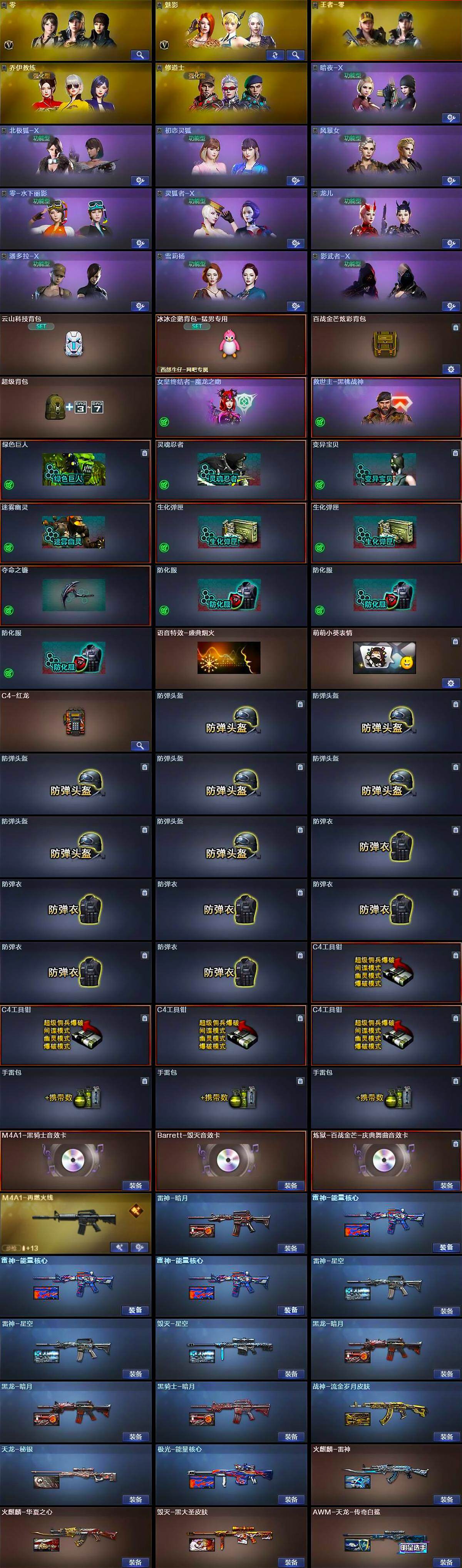 【道具】:云山科技背包,冰冰企鹅背包-猛男专用,百战金芒炫彩背包,超级背包,女皇终结者-魔龙之吻,救世主-黑桃战神,绿色巨人,灵魂忍者,变异宝贝,迷雾幽灵,生化弹匣*2,夺命之镰,防化服*3,语音特效-盛典烟火,萌萌小葵表情,C4-红龙,防弹头盔*7,防弹衣*6,C4工具钳*4,手雷包*3