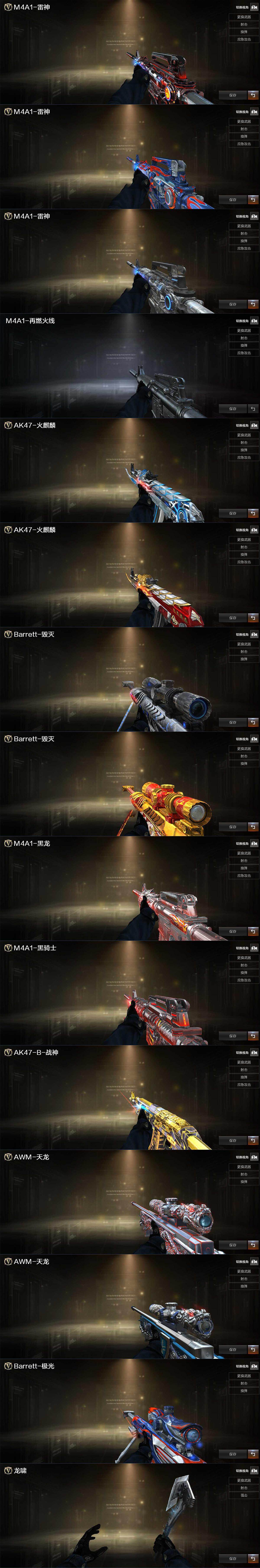 【英雄级武器】:AK47-火麒麟*3,M4A1-黑龙,M4A1-雷神*6,M4A1-黑骑士,M4A1-死神,AK47-黑武士,M4A1-武圣,AK47-机械迷城,AK47-黑鲨,M4A1-龙血,HK417-朱雀,M4A1-玫瑰精灵,QBZ03-金色蔷薇,AK47-B-战神,AWM-天龙,Barrett-毁灭*8,AWM-裁决*3,Barrett-金色蔷薇*2,加特林-炼狱*2,汤姆逊-烈龙*4,沙鹰-修罗,沙鹰-天神*2,屠龙,龙啸*2,擎天,麒麟刺*2,麒麟刺-百战金芒