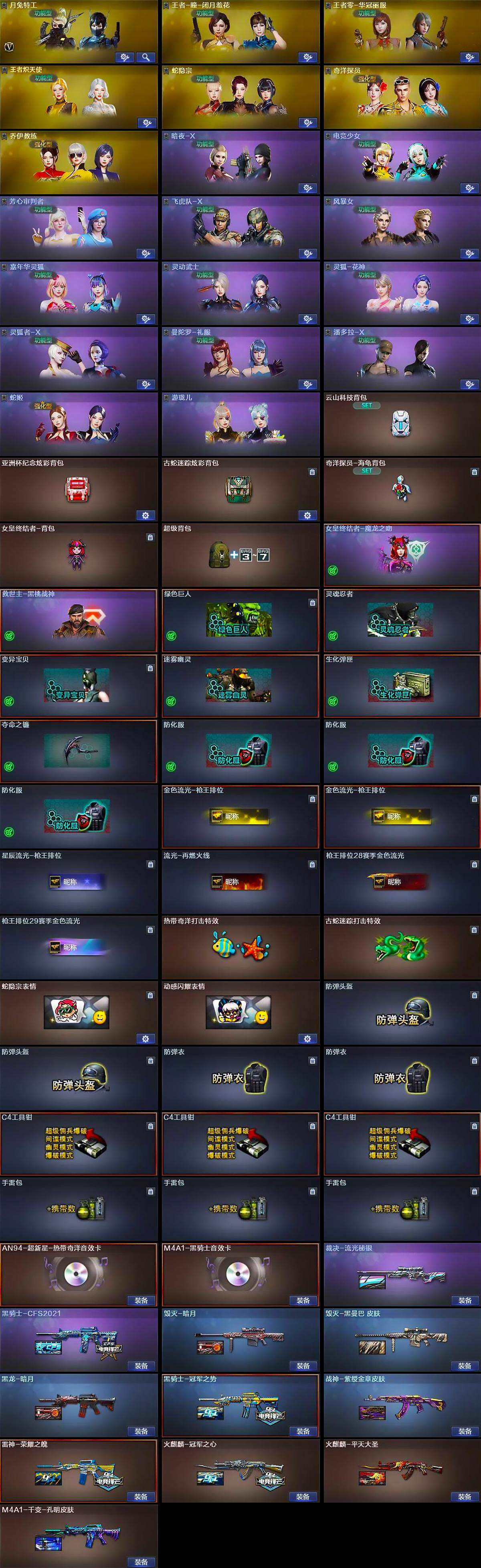 【皮肤】:裁决-流光秘银,雷神-荣耀之魄,火麒麟-冠军之心,火麒麟-平天大圣,毁灭-暗月,毁灭-黑曼巴 皮肤,毁灭-英雄计划 皮肤,M4A1-千变-孔明皮肤,黑龙-暗月,黑骑士-冠军之势,黑骑士-CFS2021,战神-紫绶金章皮肤