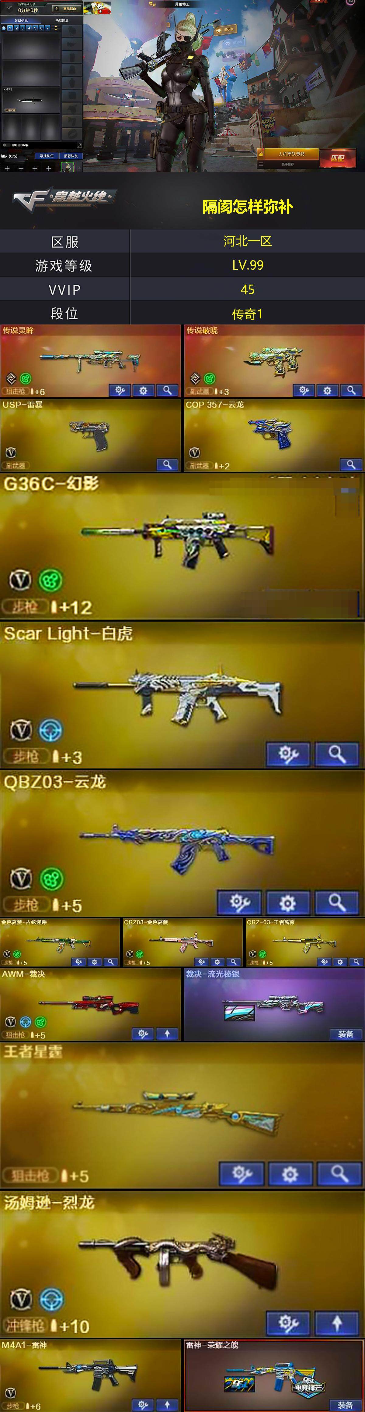 【热门武器】:传说灵眸,传说破晓,G36C-幻影,QBZ03-金色蔷薇,Scar Light-白虎,金色蔷薇-古蛇迷踪,修罗-古蛇迷踪,死亡之眼,M4A1-黑骑士,汤姆逊-烈龙,MK5-炽火炎龙,USP-雷暴,炽芒蝶刃