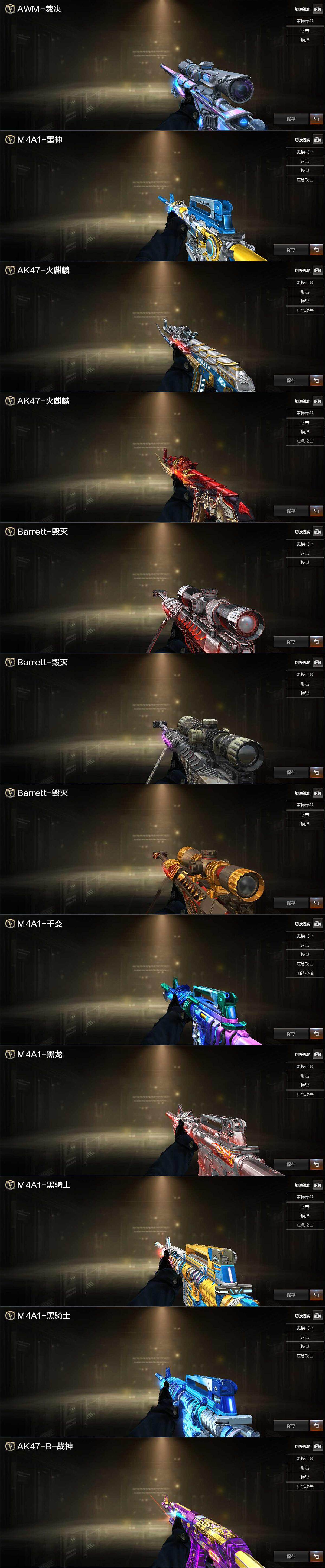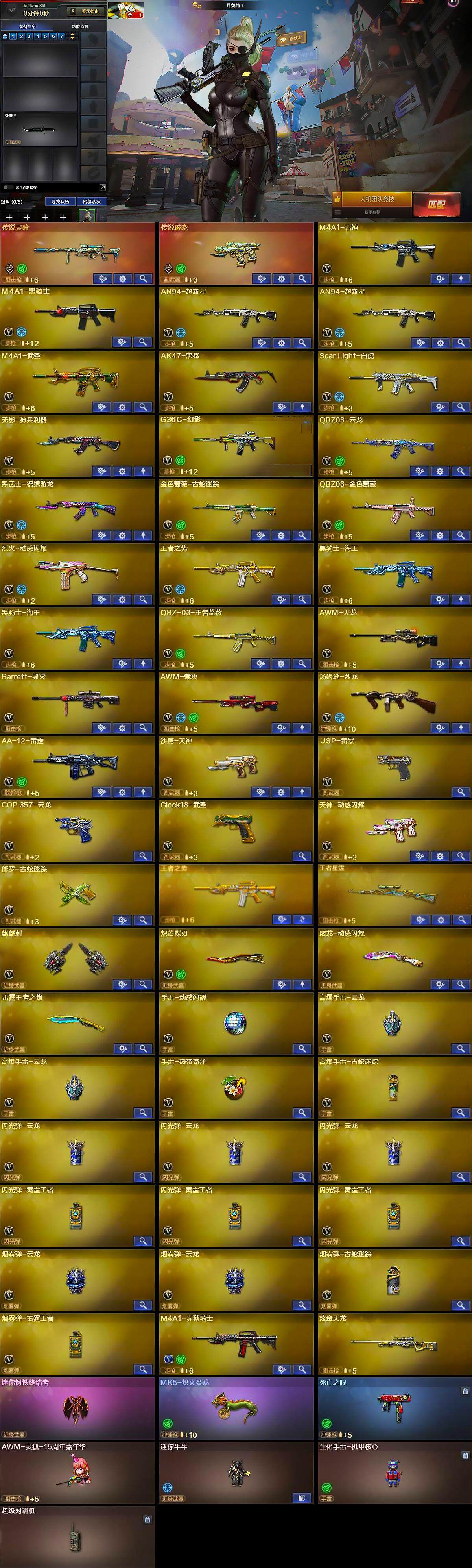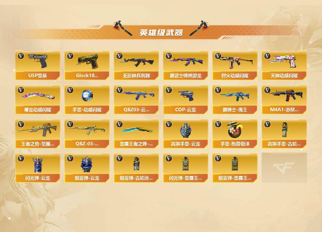 【英雄级武器】:M4A1-雷神,M4A1-黑骑士,AN94-超新星*2,M4A1-武圣,AK47-黑鲨,Scar Light-白虎,无影-神兵利器,G36C-幻影,QBZ03-云龙,黑武士-锦绣游龙,金色蔷薇-古蛇迷踪,QBZ03-金色蔷薇,烈火-动感闪耀,王者之势-觉醒版,黑骑士-海王*2,QBZ-03-王者蔷薇-觉醒版,AWM-天龙,Barrett-毁灭,AWM-裁决,汤姆逊-烈龙,AA-12-雷霆,沙鹰-天神,USP-雷暴,COP 357-云龙,Glock18-武圣,天神-动感闪耀,修罗-古蛇迷踪,麒麟刺,炽芒蝶刃,屠龙-动感闪耀,雷霆王者之锋-觉醒版,手雷-动感闪耀,高爆手雷-云龙*2,手雷-热带奇洋,高爆手雷-古蛇迷踪,闪光弹-云龙*3,闪光弹-雷霆王者-觉醒版*3,烟雾弹-云龙*2,烟雾弹-古蛇迷踪,烟雾弹-雷霆王者-觉醒版,M4A1-赤狱骑士