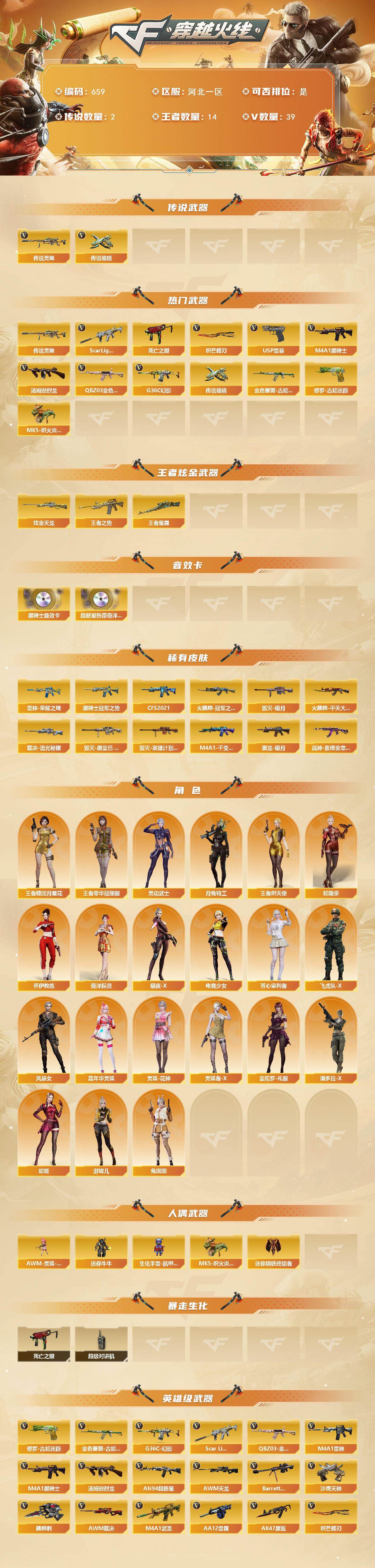 [13692487]河北一区-39V-14王者-1炫金 【传说武器】:传说灵眸,传说破晓 【热门武器】:传说灵眸,传说破晓,G36C-幻影,QBZ03-金色蔷薇,Scar Light-白虎,金色蔷薇-古蛇迷踪,修罗-古蛇迷踪,死亡之眼,M4A1-黑骑士,汤姆逊-烈龙,MK5-炽火炎龙,USP-雷暴,炽芒蝶刃 【王者炫金武器】:王者之势,王者星霆,炫金天龙 【音效卡】:AN94-超新星-热带奇洋音效卡,M4A1-黑骑士音效卡 【皮肤】:裁决-流光秘银,雷神-荣耀之魄,火麒麟-冠军之心,火麒麟-平天大圣,毁灭-暗月,毁灭-黑曼巴 皮肤,毁灭-英雄计划 皮肤,M4A1-千变-孔明皮肤,黑龙-暗月,黑骑士-冠军之势,黑骑士-CFS2021,战神-紫绶金章皮肤 【角色】:月兔特工,王者-瞳-闭月羞花,王者零-华冠丽服,王者炽天使,蛇隐宗,奇洋探员,乔伊教练,暗夜-X,电竞少女,芳心审判者,飞虎队-X,风暴女,嘉年华灵狐,灵动武士,灵狐-花神,灵狐者-X,曼陀罗-礼服,潘多拉-X,蛇姬,兔囡囡,游珑儿 【人偶武器】:迷你钢铁终结者,MK5-炽火炎龙,AWM-灵狐-15周年嘉年华,迷你牛牛,生化手雷-机甲核心 【暴走生化】:死亡之眼,超级对讲机 【英雄级武器】:M4A1-雷神,M4A1-黑骑士,AN94-超新星*2,M4A1-武圣,AK47-黑鲨,Scar Light-白虎,无影-神兵利器,G36C-幻影,QBZ03-云龙,黑武士-锦绣游龙,金色蔷薇-古蛇迷踪,QBZ03-金色蔷薇,烈火-动感闪耀,王者之势-觉醒版,黑骑士-海王*2,QBZ-03-王者蔷薇-觉醒版,AWM-天龙,Barrett-毁灭,AWM-裁决,汤姆逊-烈龙,AA-12-雷霆,沙鹰-天神,USP-雷暴,COP 357-云龙,Glock18-武圣,天神-动感闪耀,修罗-古蛇迷踪,麒麟刺,炽芒蝶刃,屠龙-动感闪耀,雷霆王者之锋-觉醒版,手雷-动感闪耀,高爆手雷-云龙*2,手雷-热带奇洋,高爆手雷-古蛇迷踪,闪光弹-云龙*3,闪光弹-雷霆王者-觉醒版*3,烟雾弹-云龙*2,烟雾弹-古蛇迷踪,烟雾弹-雷霆王者-觉醒版,M4A1-赤狱骑士 【道具】:云山科技背包,亚洲杯纪念炫彩背包,古蛇迷踪炫彩背包,奇洋探员-海龟背包,女皇终结者-背包,超级背包,女皇终结者-魔龙之吻,救世主-黑桃战神,绿色巨人,灵魂忍者,变异宝贝,迷雾幽灵,生化弹匣,夺