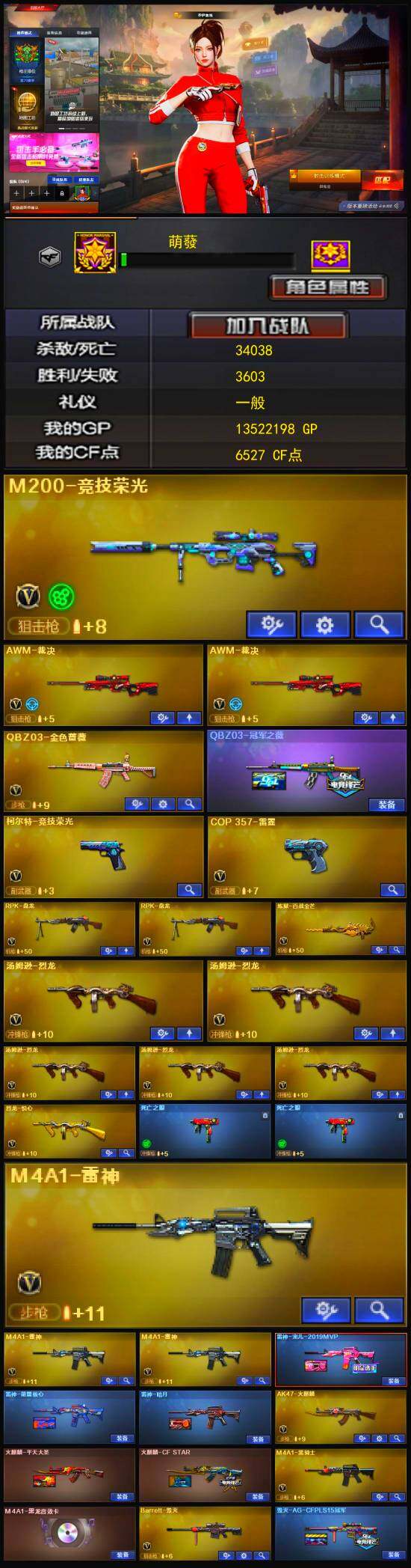 【热门武器】:QBZ03-金色蔷薇,M200-竞技荣光,死亡之眼*2,M4A1-黑骑士,汤姆逊-烈龙*5,RPK-盘龙*2,沙鹰-修罗*3