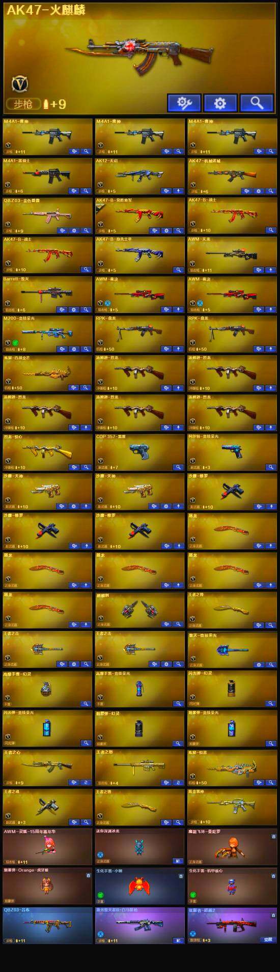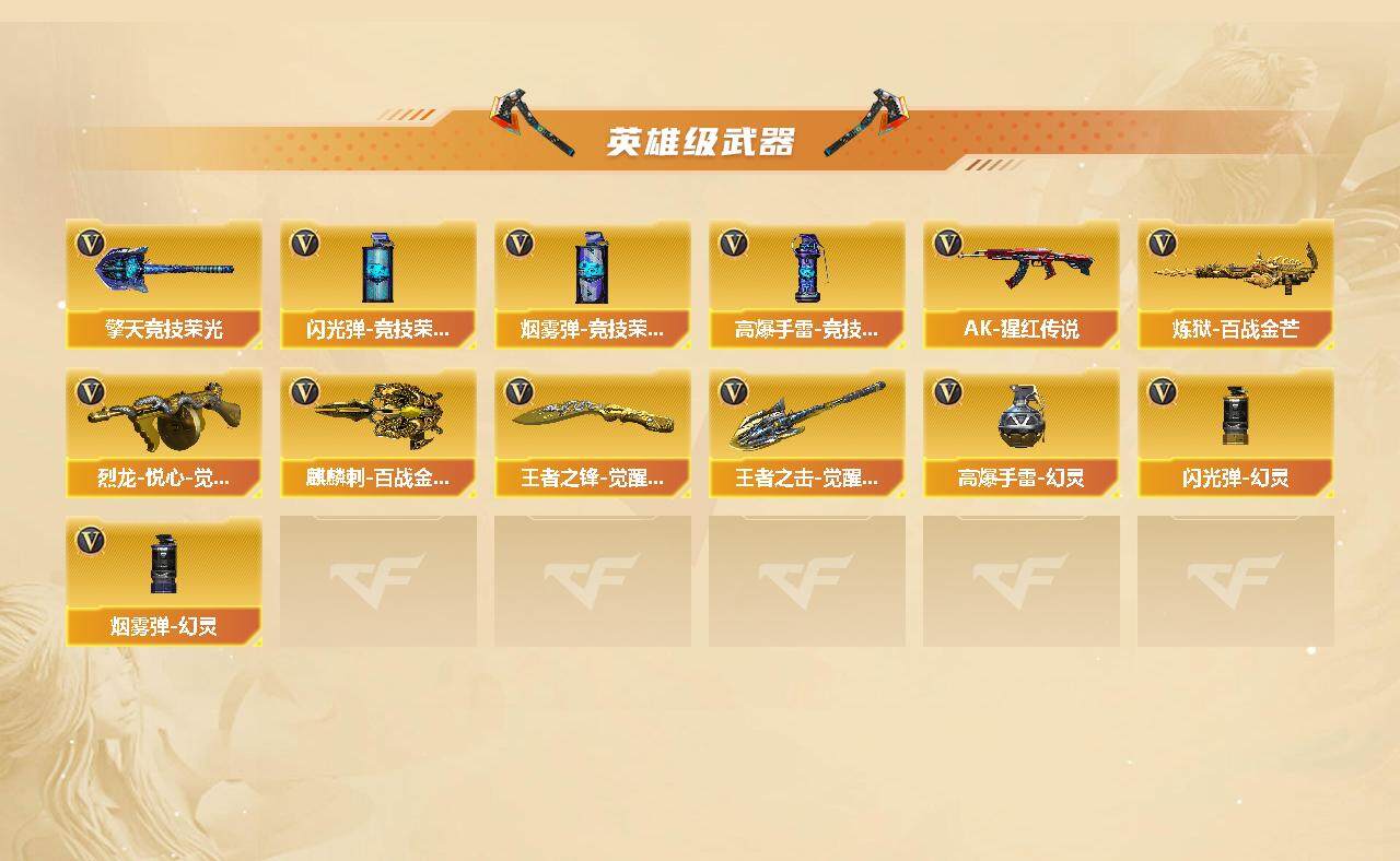 【英雄级武器】:AK47-火麒麟,M4A1-雷神*3,M4A1-黑骑士,AK12-天启,AK47-机械迷城,QBZ03-金色蔷薇,AK-47-猩红传说*3,AK47-B-常胜将军,AWM-天龙,Barrett-毁灭,AWM-裁决*2,M200-竞技荣光,RPK-盘龙*2,炼狱-百战金芒,汤姆逊-烈龙*5,烈龙-悦心-觉醒版,沙鹰-修罗*3,沙鹰-天神*2,柯尔特-竞技荣光,屠龙*5,麒麟刺,擎天-竞技荣光,麒麟刺-百战金芒,王者之锋-觉醒版,王者之击-觉醒版*2,高爆手雷-幻灵,高爆手雷-竞技荣光,闪光弹-幻灵,闪光弹-竞技荣光,烟雾弹-幻灵,烟雾弹-竞技荣光