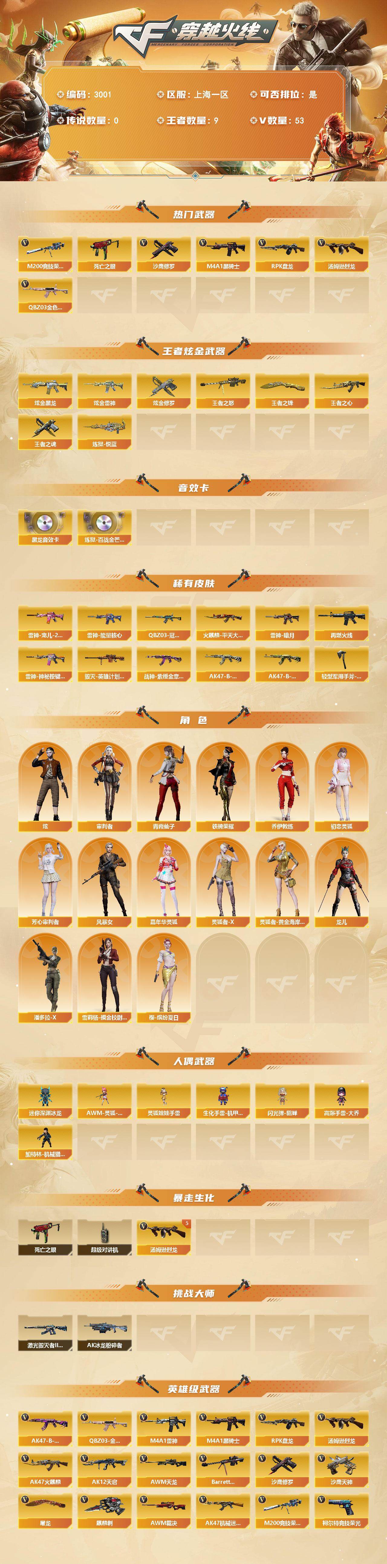 [13515931]上海一区-53V-9王者-3炫金 【热门武器】:QBZ03-金色蔷薇,M200-竞技荣光,死亡之眼*2,M4A1-黑骑士,汤姆逊-烈龙*5,RPK-盘龙*2,沙鹰-修罗*3 【王者炫金武器】:王者之心,王者之怒,炼狱-悦蓝,王者之魂,王者之锋,炫金黑龙,炫金雷神,炫金修罗 【音效卡】:M4A1-黑龙音效卡,炼狱-百战金芒-庆典舞曲音效卡 【皮肤】:QBZ03-冠军之薇,雷神-暗月,雷神-能量核心,雷神-宠儿-2019MVP,M4A1-再燃火线,雷神-神秘按键 皮肤,火麒麟-平天大圣,毁灭-英雄计划 皮肤,战神-紫绶金章皮肤*2,AK47-B-常胜将军-刘备,AK47-B-常胜将军-孙权,轻型军用手斧-再燃火线 【角色】:炫,审判者,乔伊教练,初恋灵狐,芳心审判者,风暴女,嘉年华灵狐,灵狐者-X,灵狐者-黄金海岸,龙儿,潘多拉-X,青霞仙子,铁骑荣耀,雪莉杨-摸金校尉,樱-缤纷夏日 【人偶武器】:加特林-机械猎手,AWM-灵狐-15周年嘉年华,迷你深渊冰龙,生化手雷-机甲核心,闪光弹-貂蝉,高爆手雷-大乔,灵狐娃娃手雷 【暴走生化】:死亡之眼*2,超级对讲机 【挑战大师】:AK47-冰龙粉碎者,激光毁灭者III-白马银枪 【英雄级武器】:AK47-火麒麟,M4A1-雷神*3,M4A1-黑骑士,AK12-天启,AK47-机械迷城,QBZ03-金色蔷薇,AK-47-猩红传说*3,AK47-B-常胜将军,AWM-天龙,Barrett-毁灭,AWM-裁决*2,M200-竞技荣光,RPK-盘龙*2,炼狱-百战金芒,汤姆逊-烈龙*5,烈龙-悦心-觉醒版,沙鹰-修罗*3,沙鹰-天神*2,柯尔特-竞技荣光,屠龙*5,麒麟刺,擎天-竞技荣光,麒麟刺-百战金芒,王者之锋-觉醒版,王者之击-觉醒版*2,高爆手雷-幻灵,高爆手雷-竞技荣光,闪光弹-幻灵,闪光弹-竞技荣光,烟雾弹-幻灵,烟雾弹-竞技荣光 【道具】:AG战队炫彩背包,女皇终结者-背包,炫彩背包,百战金芒炫彩背包,背包-洛丽塔,超级背包,女皇终结者-魔龙之吻,绿色巨人,灵魂忍者,变异宝贝,迷雾幽灵,生化弹匣,夺命之镰,防化服*2,金色流光-枪王排位*2,星辰流光-枪王排位,枪王排位28赛季金色流光,枪王排位29赛季金色流光,语音特效-盛典烟火,萌萌小葵表情,C4-红龙,防弹头盔*3,防弹衣*3,C4工具钳*3,手雷包*3 【特殊