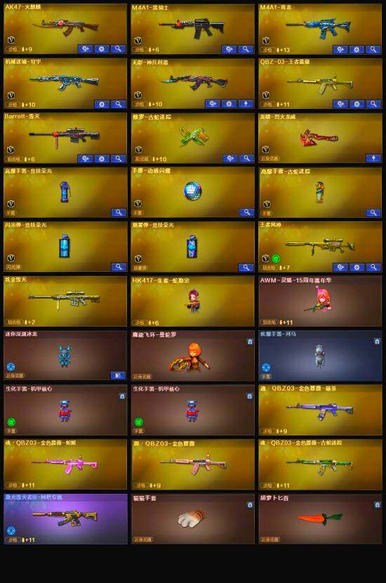 【英雄级武器】:AK47-火麒麟,M4A1-黑骑士,M4A1-青龙,无影-神兵利器,QBZ-03-王者蔷薇-觉醒版,Barrett-毁灭,修罗-古蛇迷踪,高爆手雷-竞技荣光,手雷-动感闪耀,高爆手雷-古蛇迷踪,闪光弹-竞技荣光,烟雾弹-竞技荣光,烟雾弹-古蛇迷踪
