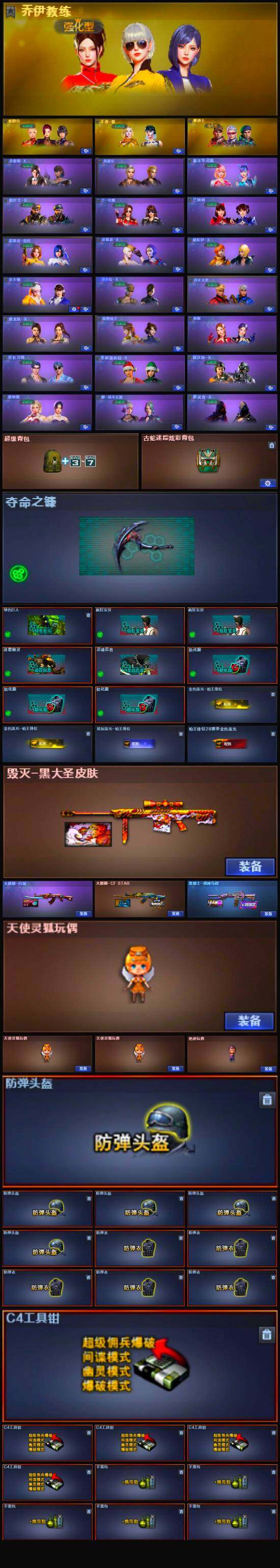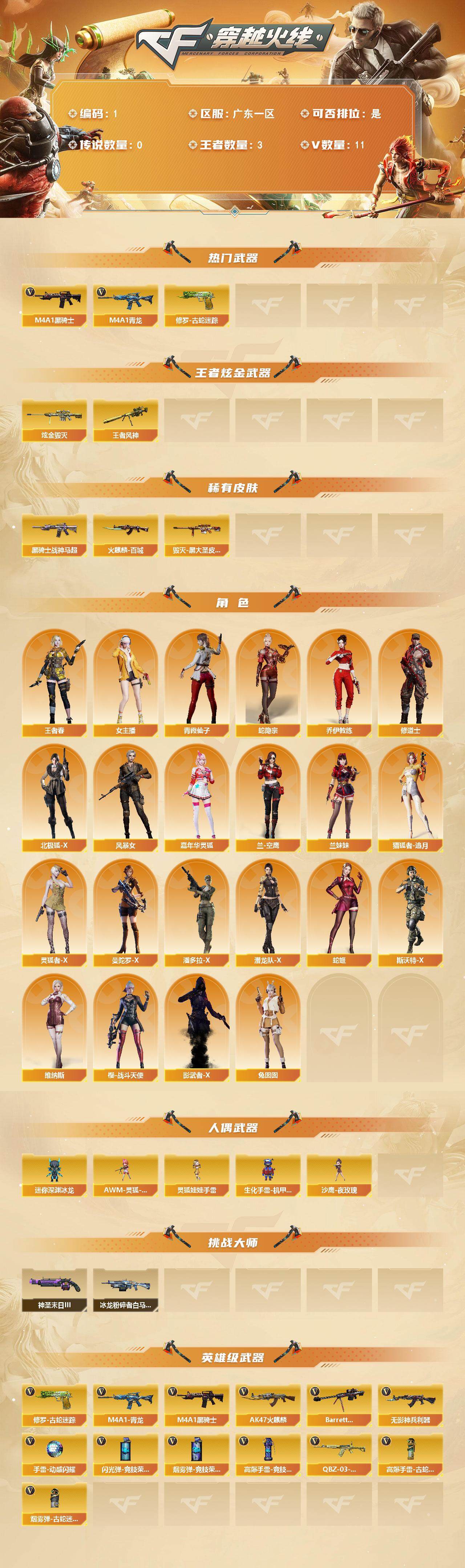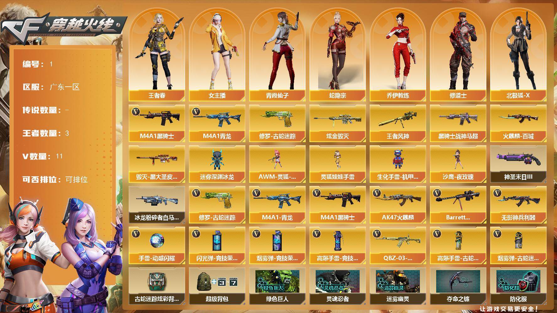 [13524841]广东一区-11V-3王者-1炫金 【热门武器】:M4A1-青龙,修罗-古蛇迷踪,M4A1-黑骑士 【王者炫金武器】:王者风神,炫金毁灭 【皮肤】:火麒麟-百城,毁灭-黑大圣皮肤,黑骑士-战神马超 【角色】:王者春,蛇隐宗,乔伊教练,修道士,北极狐-X,风暴女,嘉年华灵狐,兰-空鹰,兰妹妹,猎狐者-追月,灵狐者-X,曼陀罗-X,女主播,潘多拉-X,潜龙队-X,青霞仙子,蛇姬,斯沃特-X,兔囡囡,维纳斯,樱-战斗天使,影武者-X 【人偶武器】:AWM-灵狐-15周年嘉年华,迷你深渊冰龙,生化手雷-机甲核心*2,沙鹰-夜玫瑰,灵狐娃娃手雷 【挑战大师】:冰龙粉碎者-白马银枪,神圣爆裂者-末日III*2 【英雄级武器】:AK47-火麒麟,M4A1-黑骑士,M4A1-青龙,无影-神兵利器,QBZ-03-王者蔷薇-觉醒版,Barrett-毁灭,修罗-古蛇迷踪,高爆手雷-竞技荣光,手雷-动感闪耀,高爆手雷-古蛇迷踪,闪光弹-竞技荣光,烟雾弹-竞技荣光,烟雾弹-古蛇迷踪 【道具】:古蛇迷踪炫彩背包,超级背包,绿色巨人,灵魂忍者,迷雾幽灵,夺命之镰,防化服*3,金色流光-枪王排位*2,星辰流光-枪王排位,枪王排位28赛季金色流光,枪王排位29赛季金色流光,语音特效-生化,古蛇迷踪打击特效,蛇隐宗表情,防弹头盔*5,防弹衣*5,C4工具钳*5,手雷包*5 【特殊枪械】:1黑骑士