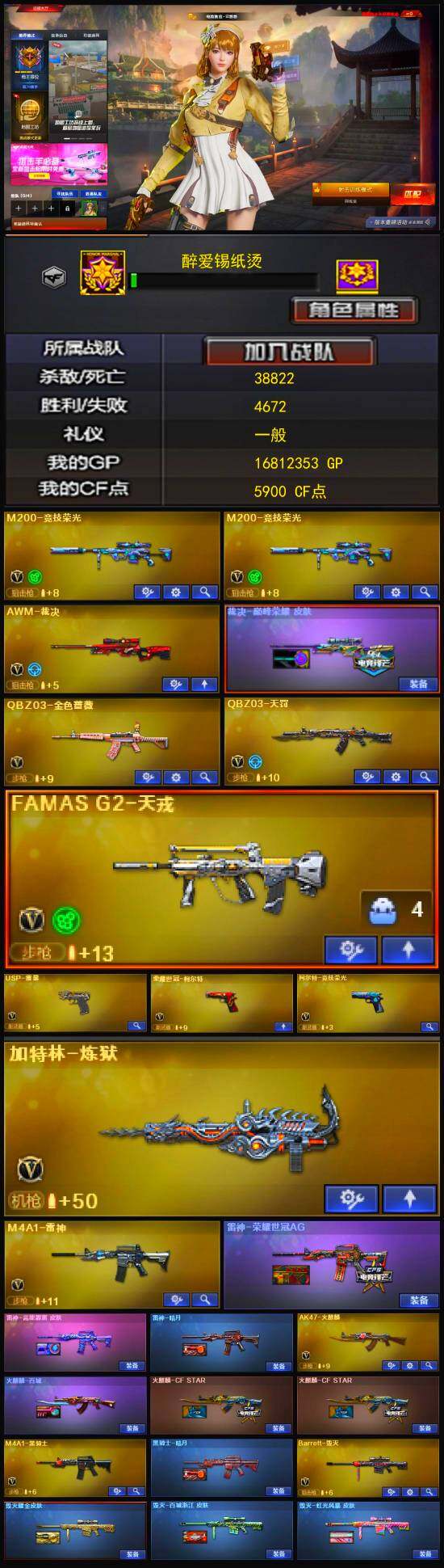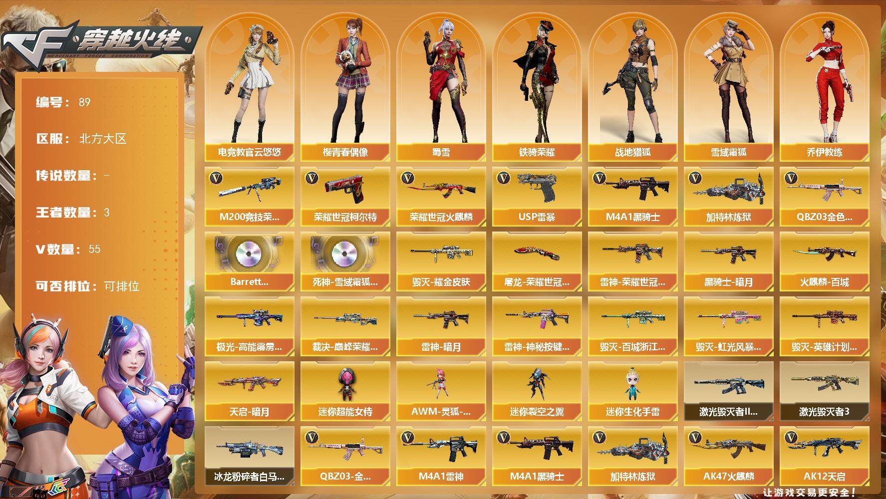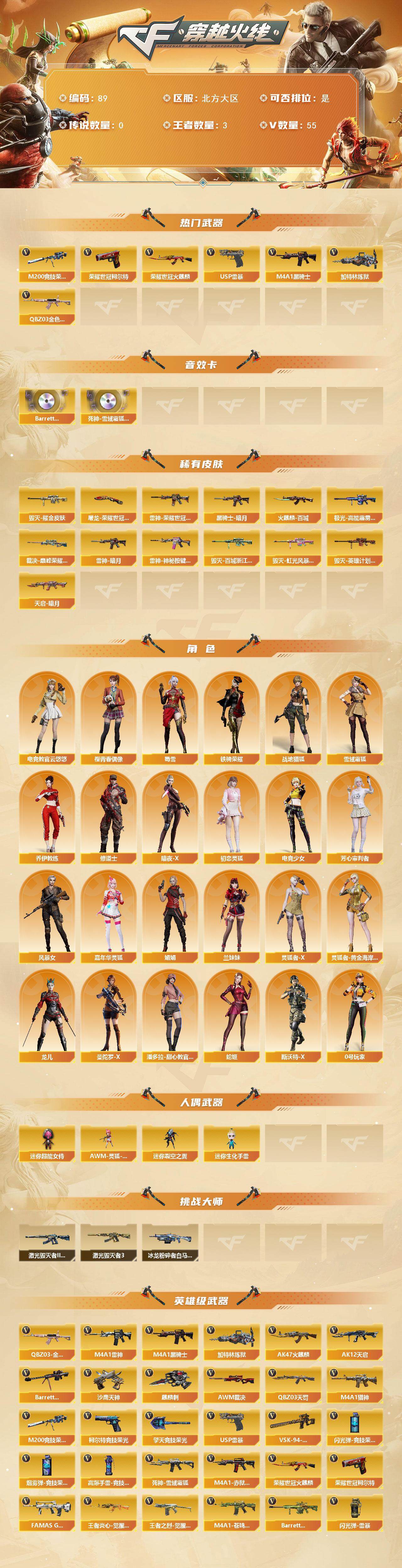 [13719737]北方大区-55V-3王者-0炫金 【热门武器】:QBZ03-金色蔷薇,M200-竞技荣光*2,荣耀世冠-火麒麟,荣耀世冠-柯尔特,M4A1-黑骑士,加特林-炼狱,USP-雷暴 【音效卡】:Barrett-碧霄极光音效卡,死神-雪域霜狐-怀旧音效卡 【皮肤】:裁决-巅峰荣耀 皮肤,雷神-暗月,雷神-荣耀世冠AG,雷神-神秘按键 皮肤,火麒麟-百城,毁灭耀金皮肤,毁灭-百城浙江 皮肤,毁灭-虹光风暴 皮肤,毁灭-英雄计划 皮肤,黑骑士-暗月,天启-暗月,极光-高能霹雳 皮肤,屠龙-荣耀世冠AG 【角色】:电竞教官-云悠悠,战地猎狐,雪域霜狐,乔伊教练,修道士,暗夜-X,初恋灵狐,电竞少女,芳心审判者,风暴女,嘉年华灵狐,娟娟,兰妹妹,0号玩家,灵狐者-X,灵狐者-黄金海岸,龙儿,曼陀罗-X,潘多拉-甜心教官,蛇姬,斯沃特-X,蜀雪,铁骑荣耀,樱-青春偶像 【人偶武器】:AWM-灵狐-15周年嘉年华*2,迷你裂空之翼,迷你生化手雷,迷你超能女侍 【挑战大师】:冰龙粉碎者-白马银枪,激光毁灭者III-白马银枪,激光毁灭者III 【英雄级武器】:AK47-火麒麟,M4A1-雷神,M4A1-黑骑士,AK12-天启,QBZ03-天罚,FAMAS G2-天戎,死神-雪域霜狐,QBZ03-金色蔷薇,M4A1-猎神,王者炎心-觉醒版,王者之烈-觉醒版,荣耀世冠-火麒麟,Barrett-毁灭,AWM-裁决,M200-竞技荣光*2,VSK-94-金蚀,加特林-炼狱,沙鹰-天神*4,USP-雷暴,荣耀世冠-柯尔特,柯尔特-竞技荣光,麒麟刺*2,擎天-竞技荣光,高爆手雷-竞技荣光*7,闪光弹-雷暴,闪光弹-竞技荣光*8,烟雾弹-竞技荣光*7,M4A1-赤狱骑士,M4A1-苍鸣雷神,Barrett-碧霄极光 【道具】:BS战队炫彩背包,CFS限定背包,云山科技背包,亚洲杯纪念炫彩背包,炫彩背包-诺拉,雪域霜狐炫彩背包,女皇终结者-魔龙之吻,救世主-黑桃战神,绿色巨人,灵魂忍者,迷雾幽灵,生化弹匣,夺命之镰,防化服*3,金色流光-枪王排位*2,星辰流光-枪王排位,流光-鎏金之域,流光-再燃火线,枪王排位28赛季金色流光,枪王排位29赛季金色流光,语音特效-怀旧,雪域霜狐表情,EP战队名片,EP战队喷图,EP战队击杀图标,C4-再燃火线*2,防弹头盔*5,防弹衣*5,C4工具钳*4,手雷包*5 【