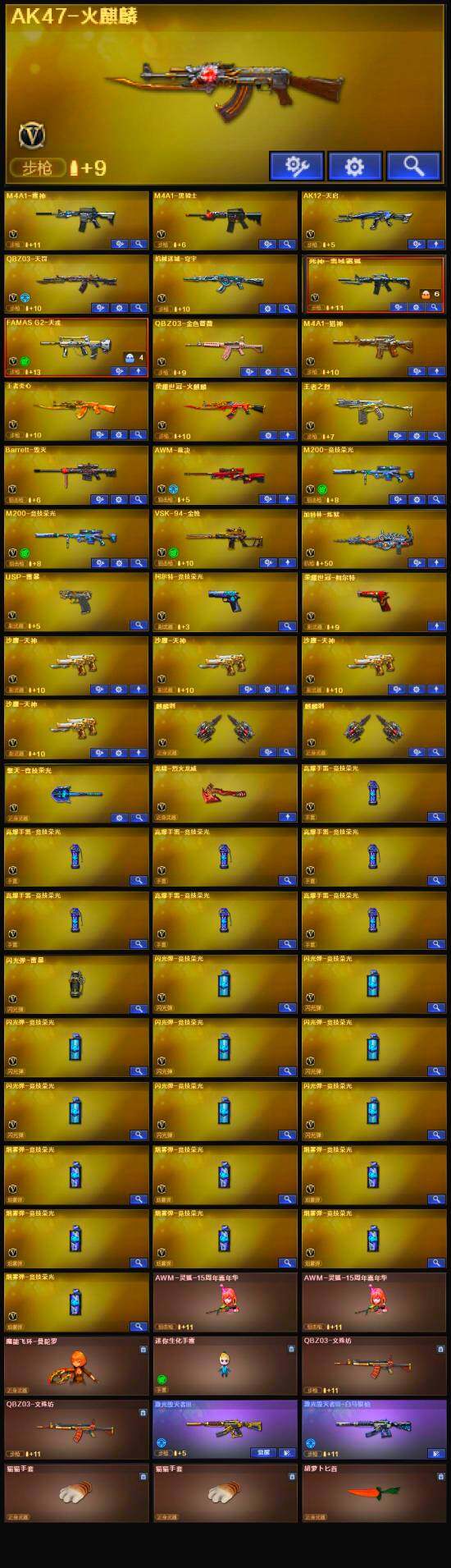 【英雄级武器】:AK47-火麒麟,M4A1-雷神,M4A1-黑骑士,AK12-天启,QBZ03-天罚,FAMAS G2-天戎,死神-雪域霜狐,QBZ03-金色蔷薇,M4A1-猎神,王者炎心-觉醒版,王者之烈-觉醒版,荣耀世冠-火麒麟,Barrett-毁灭,AWM-裁决,M200-竞技荣光*2,VSK-94-金蚀,加特林-炼狱,沙鹰-天神*4,USP-雷暴,荣耀世冠-柯尔特,柯尔特-竞技荣光,麒麟刺*2,擎天-竞技荣光,高爆手雷-竞技荣光*7,闪光弹-雷暴,闪光弹-竞技荣光*8,烟雾弹-竞技荣光*7,M4A1-赤狱骑士,M4A1-苍鸣雷神,Barrett-碧霄极光