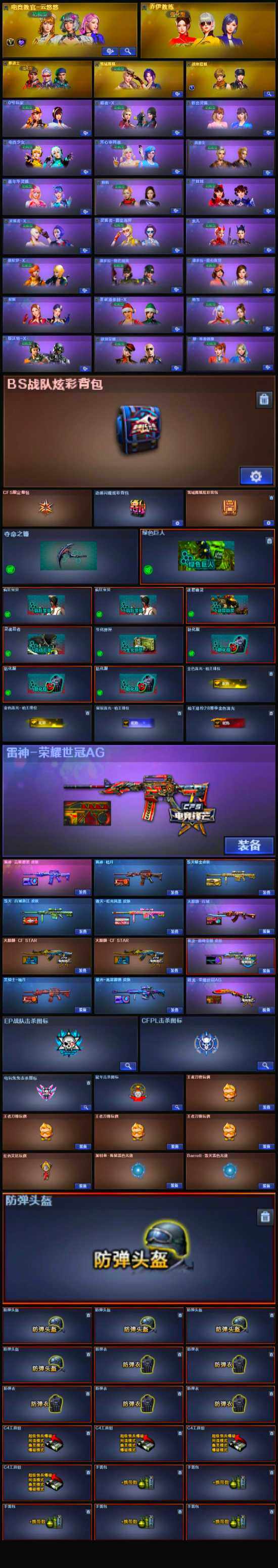 【道具】:BS战队炫彩背包,CFS限定背包,云山科技背包,亚洲杯纪念炫彩背包,炫彩背包-诺拉,雪域霜狐炫彩背包,女皇终结者-魔龙之吻,救世主-黑桃战神,绿色巨人,灵魂忍者,迷雾幽灵,生化弹匣,夺命之镰,防化服*3,金色流光-枪王排位*2,星辰流光-枪王排位,流光-鎏金之域,流光-再燃火线,枪王排位28赛季金色流光,枪王排位29赛季金色流光,语音特效-怀旧,雪域霜狐表情,EP战队名片,EP战队喷图,EP战队击杀图标,C4-再燃火线*2,防弹头盔*5,防弹衣*5,C4工具钳*4,手雷包*5