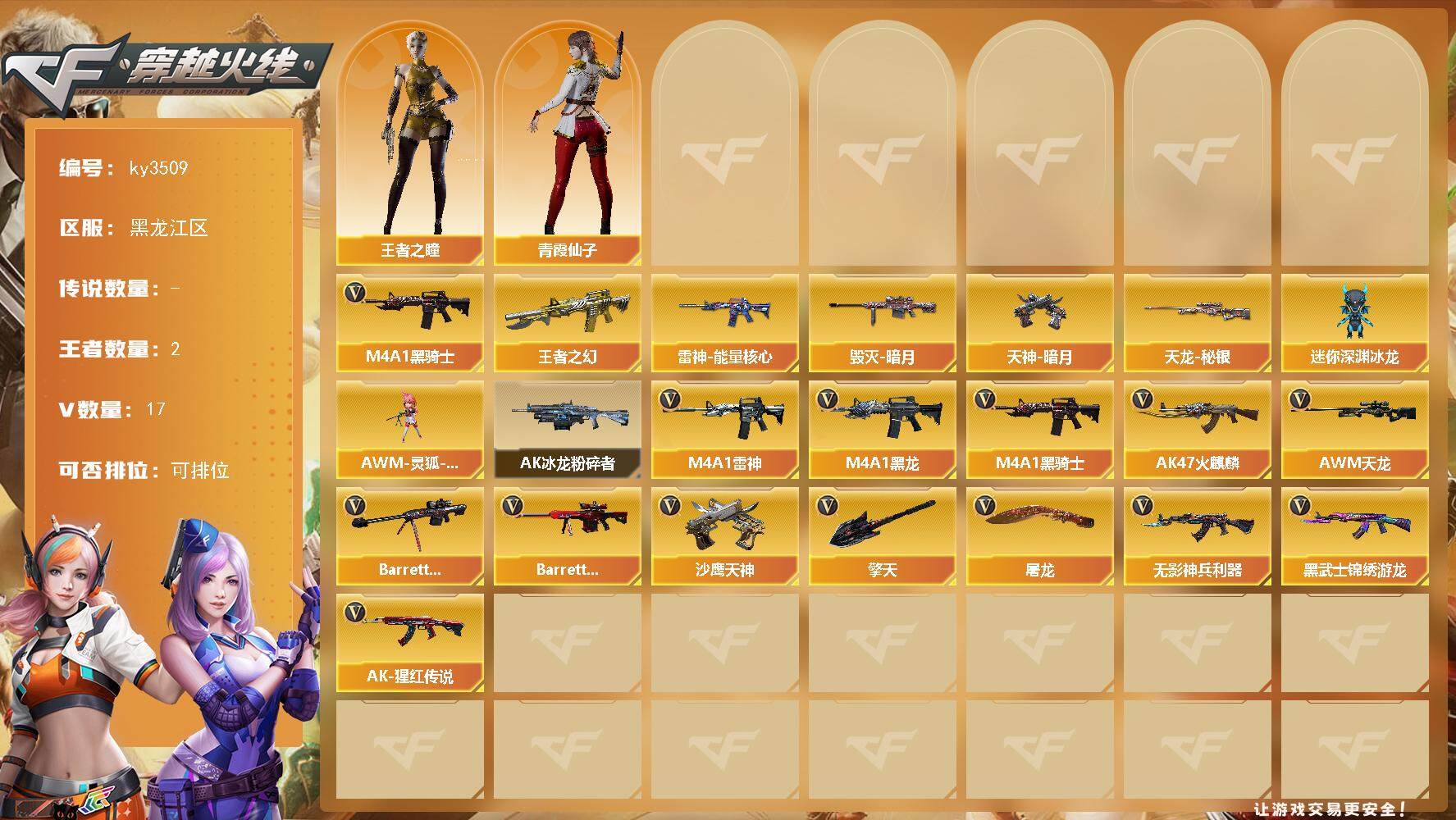 [13720467]黑龙江区-17V-2王者-0炫金 【热门武器】:M4A1-黑骑士 【王者炫金武器】:王者之幻 【稀有皮肤】:雷神-能量核心,毁灭-暗月*2,天龙-秘银,天神-暗月 【角色】:王者之瞳,青霞仙子 【人偶武器】:AWM-灵狐-15周年嘉年华,迷你深渊冰龙 【挑战大师】:AK47-冰龙粉碎者 【英雄级武器】:无影-神兵利器,M4A1-雷神,M4A1-黑龙,M4A1-黑骑士,AK47-火麒麟*3,AWM-天龙,Barrett-毁灭,Barrett-极光,黑武士-锦绣游龙,AK-47-猩红传说,沙鹰-天神,擎天,屠龙*3 【特殊枪械】:1黑骑士