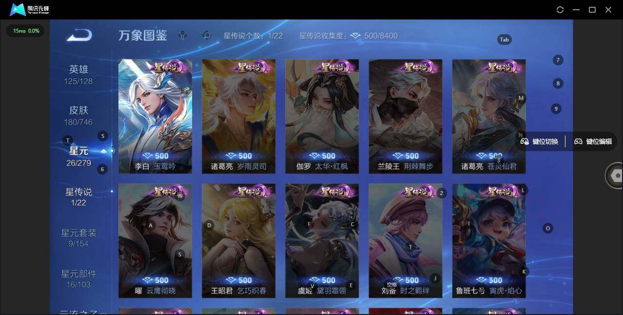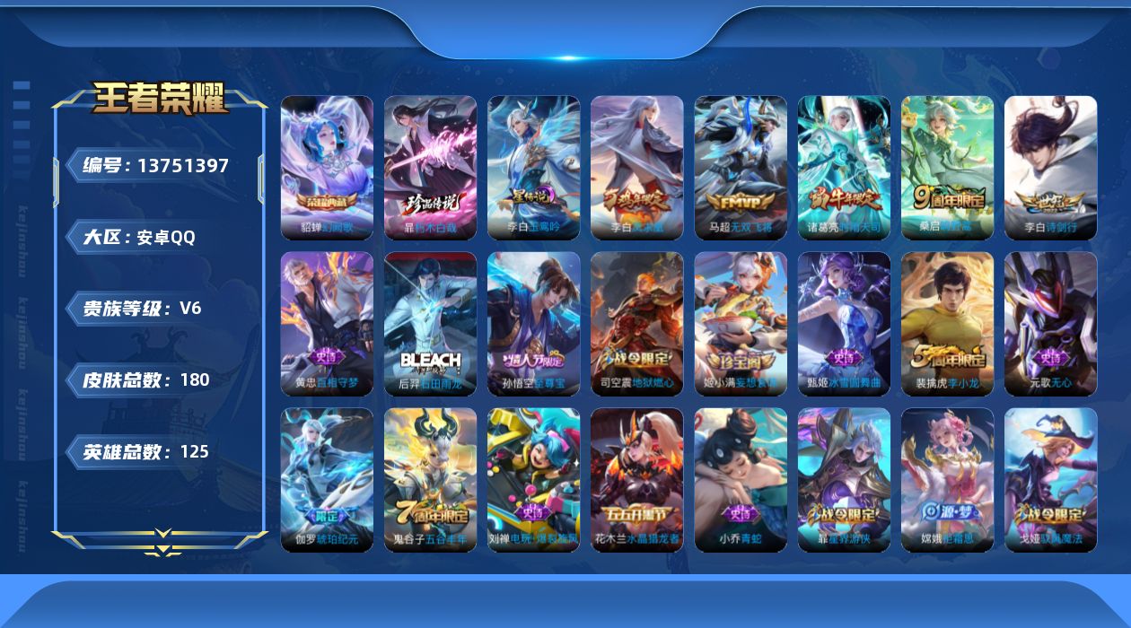 - [13072507]安卓Q-V5-至尊星耀IV段位-126英雄-225皮肤-1典藏-0珍品无双-0无双-0珍品传说-7传说-70史诗 【荣耀典藏】:诸葛亮星域神启 【传说皮肤】:桑启鸣野蒿,镜炽阳神光,刘备时之恋人,张良黄金白羊座,干将莫邪久胜战神,达摩黄金狮子座,孙尚香末日机甲 【限定皮肤】:白起狰,姜子牙天穹之誓,狄仁杰阴阳师,虞姬凯尔特女王,赵云皇家上将,墨子神迹守卫,嬴政优雅恋人,庄周高山流水,高渐离死亡摇滚,扁鹊炼金王,芈月重明,元歌云间偶戏,元歌无心,夏侯惇朔风刀,甄姬游园惊梦,曹操烛龙,典韦穷奇,马可波罗暗影游猎,狄仁杰魔术师,狄仁杰万华元夜,达摩沙漠行僧,项羽海滩派对,老夫子醍醐杖,老夫子航海奇遇记,程咬金演武夺筹,兰陵王金庭之子,亚瑟潮玩骑士王,孙悟空大圣娶亲,牛魔御旌,李元芳云中旅人,钟馗驱傩正仪,杨玉环遇见飞天,干将莫邪冰霜恋舞曲,雅典娜黎明之约,太乙真人饕餮,鬼谷子原初探秘者,鬼谷子五谷丰年,苏烈千军破阵,百里玄策原初追逐者,弈星混沌棋,沈梦溪大漠名商,明世隐疑决卦,裴擒虎李小龙,裴擒虎擒涛扼浪,狂铁御狮,米莱狄御霄,云中君纤云弄巧,伽罗天狼溯光者,盾山御銮,猪八戒西部大镖客,猪八戒猪悟能,上官婉儿梁祝,嫦娥拒霜思,鲁班大师探海日志,桑启海盐诗旅,艾琳女武神,阿古朵江河有灵,张良古海寻踪,鬼谷子天穹祈灯,沈梦溪龙舞盛年,周瑜熔金海岸 【年限皮肤】:马超神威 【赛季限定】:扁鹊炼金王,白起狰,芈月重明,夏侯惇朔风刀,曹操烛龙,典韦穷奇,狄仁杰万华元夜,达摩沙漠行僧,老夫子醍醐杖,程咬金演武夺筹,兰陵王金庭之子,张良古海寻踪,牛魔御旌,李元芳云中旅人,虞姬凯尔特女王,钟馗驱傩正仪,雅典娜黎明之约,太乙真人饕餮,鬼谷子原初探秘者,苏烈千军破阵,百里玄策原初追逐者,弈星混沌棋,沈梦溪大漠名商,明世隐疑决卦,裴擒虎擒涛扼浪,狂铁御狮,米莱狄御霄,盾山御銮,鲁班大师探海日志,桑启海盐诗旅,鬼谷子天穹祈灯,姜子牙天穹之誓 【战令限定】:墨子神迹守卫,元歌云间偶戏,马可波罗暗影游猎,老夫子航海奇遇记,亚瑟潮玩骑士王,猪八戒西部大镖客 【史诗皮肤】:鲁班七号电玩小子,项羽苍穹之光,赵云皇家上将,赵云未来纪元,貂蝉圣诞恋歌,甄姬冰雪圆舞曲,王昭君偶像歌手,狄仁杰魔术师,廉颇地狱岩魂,宫本武藏鬼剑武藏,孙尚香水果甜心,嬴政优雅恋人,嬴政暗夜贵公子,嬴政摇滚巨星,妲己魅力维加斯,妲己