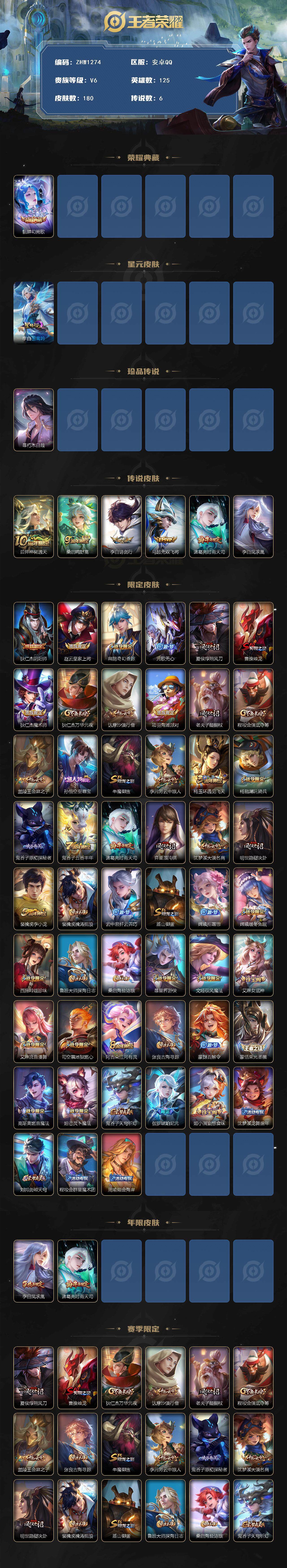 - [11737993]V8 1典藏 1珍品传说 18传说 125英雄 336皮肤 可修改实名 优质装备:九霄神辉(木兰典藏),黄金射手座,云鹰飞将(小将军),黄金白羊座,久胜战神,一念神魔,云霓雀翎,仲夏夜之梦(大飞蛾),音你心动-小乔,地狱之眼,时之恋人-刘备(电焊工),淬星耀世,末日机甲-孙策,玄雷天君,涂山容容 珍品传说:时之奇旅-孙策 传说皮:幻光神枪 珍宝阁皮:万物之道,优雅恋人,玩趣恶龙 限定皮:逐霄战戟,鸣野蒿,至尊宝,异界灵契(白毛香),神威(电光马子),飞衡(韩信年限),遇见飞天,高山流水,怒海麟威,降魔,五谷丰年,青龙志(铠年限),冰锋战神,游园惊梦,烈魂,岱宗(典韦年限),李小龙,孙行者,青春决赛季,冰霜恋舞曲,匿光追影者,神器·万象笔,山海·玄木吟(马可年限) 史诗皮:灵蛊蚀心,星界战将,谪仙醉月,龙之律动,石田雨龙,茶境仙,怒海争锋,撼地雄心,破空之剑,决胜骁骑,蔬乡物语(鲁班七号),百相守梦-百里守约,百相守梦-黄忠,紫霞仙子,苍穹之光,电玩小子(小书包),黄金分割率,特工魅影,千年之狐,江河有灵,魅语,百解令(蒙犽),高渐离燃音魔法,无限星赏官,青蛇,偶像歌手,末日机甲-吕布,猫狗日记-孙策,猫狗日记-大乔,乱世虎臣,节奏热浪,修罗,女仆咖啡,摇滚巨星,水果甜心,绅士熊喵,天才门将,星夜王子,心灵骇客,时之奇旅-安琪拉,功夫厨神,德古拉伯爵,暗隐猎兽者,幽灵船长,鬼剑武藏,心灵战警,乐园奇幻夜,天秀·启明,舞动绿茵,地狱岩魂,诗语江南,纤云弄巧,拒霜思,缤纷独角兽,乘风破浪,逐浪之夏,月团寄思,水晶猎龙者,曙光守护者,热力回旋,箭羽风息,金属风暴,圣诞狂欢,圣诞恋歌,鹰眼统帅,暗夜贵公子,魅力维加斯,黎明之约,赏金猎手,无心,未来纪元-赵云