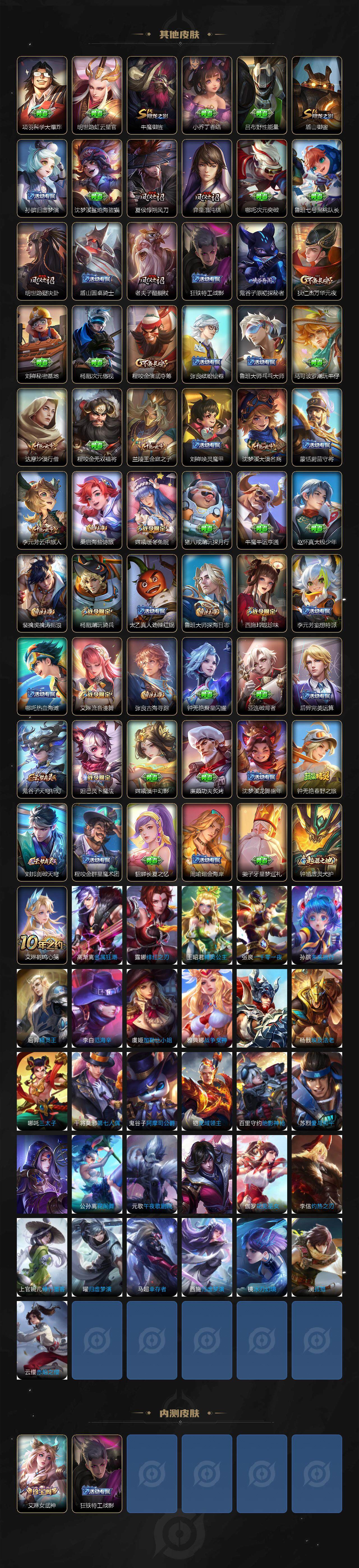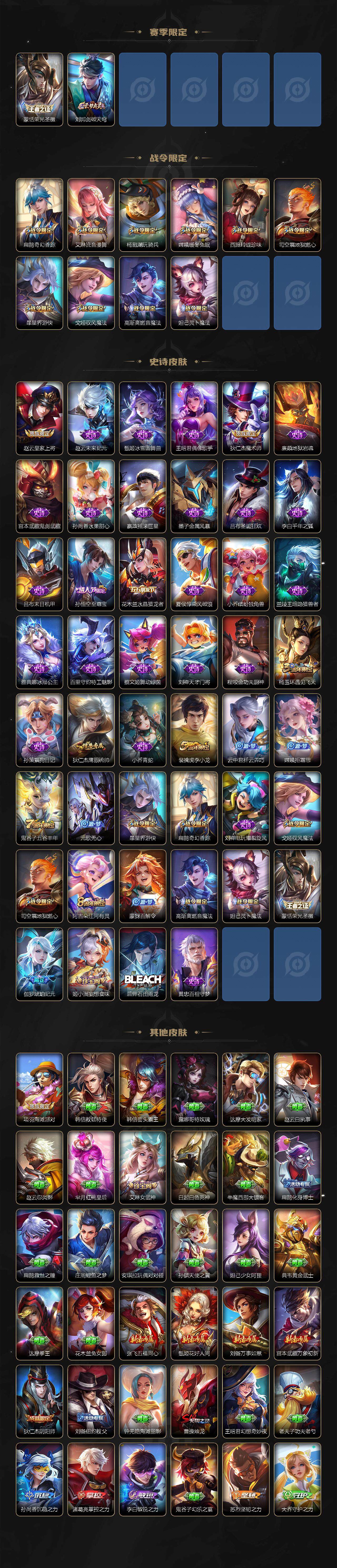 【限定皮肤】:狄仁杰阴阳师,赵云皇家上将,扁鹊奇幻香踪,元歌无心,夏侯惇朔风刀,曹操烛龙,狄仁杰魔术师,狄仁杰万华元夜,达摩沙漠行僧,项羽海滩派对,老夫子醍醐杖,程咬金演武夺筹,兰陵王金庭之子,孙悟空至尊宝,牛魔御旌,李元芳云中旅人,杨玉环遇见飞天,杨戬潮玩骑兵,鬼谷子原初探秘者,鬼谷子五谷丰年,诸葛亮时雨天司,弈星混沌棋,沈梦溪大漠名商,明世隐疑决卦,裴擒虎李小龙,裴擒虎擒涛扼浪,云中君纤云弄巧,盾山御銮,嫦娥拒霜思,嫦娥暖冬兔眠,西施玲珑珍味,鲁班大师探海日志,桑启海盐诗旅,暃星界游侠,戈娅驭风魔法,艾琳女武神,艾琳流音漫舞,司空震地狱燃心,阿古朵江河有灵,张良古海寻踪,蒙犽百解令,蒙恬荣光圣徽,高渐离燃音魔法,妲己灵卜魔法,鬼谷子天穹祈灯,伽罗琥珀纪元,姬小满妄想食味,沈梦溪龙舞盛年,刘邦剑破天穹,程咬金群星魔术团,周瑜熔金海岸