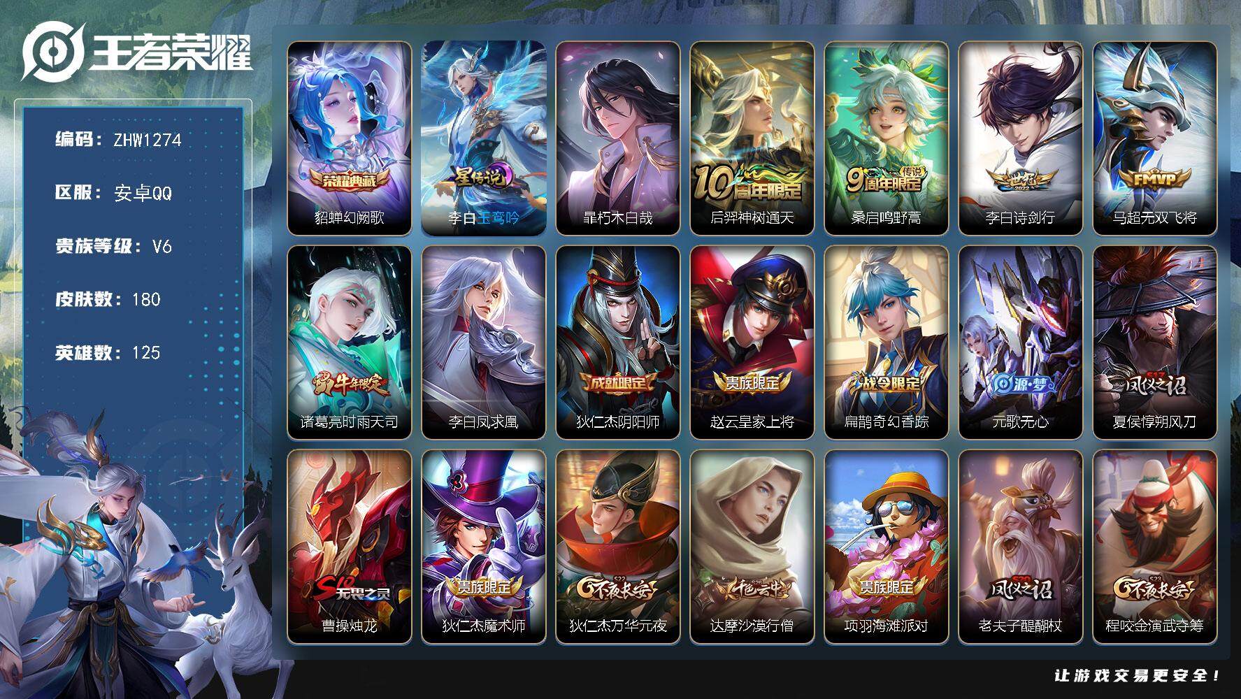 [13751397]可二次【店主推荐捡漏号!可直接换绑,安卓Q-V6-永恒钻石II段位-125英雄-180皮肤-1典藏-1珍品传说-6传说-45史诗