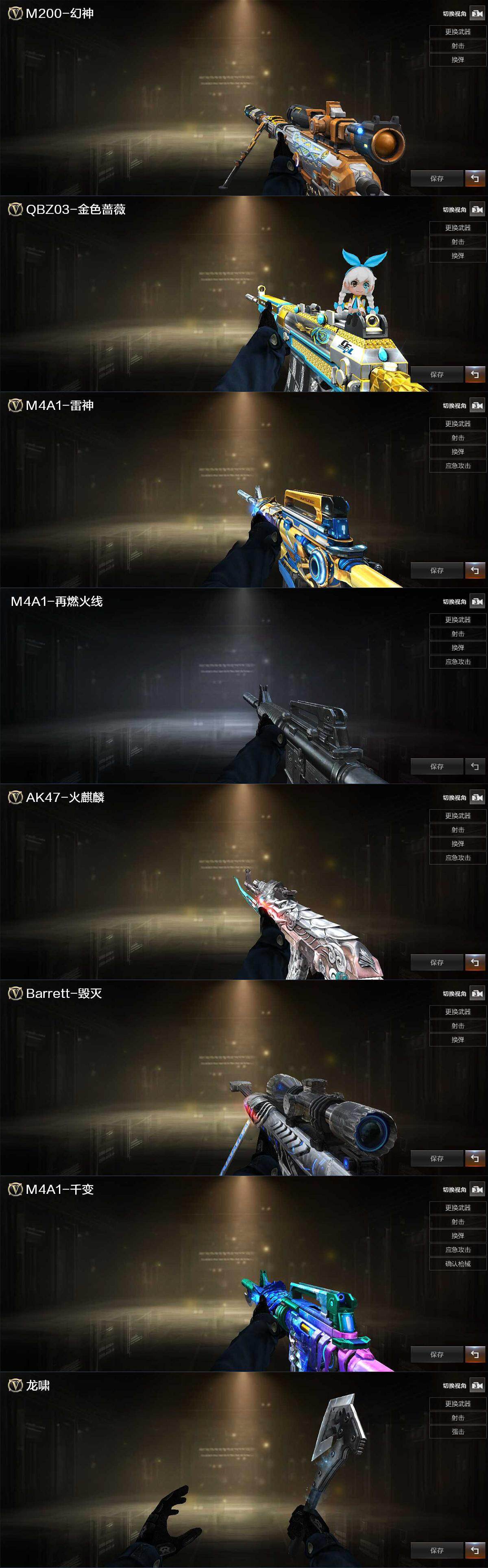 【热门武器】:QBZ03-金色蔷薇,M200-幻神,死亡之眼,白虎-电玩蓝兔,M4A1-黑骑士,汤姆逊-烈龙*6,RPK-盘龙*7,加特林-炼狱*3,斯泰尔-蝴蝶,USP-雷暴,金刚伞