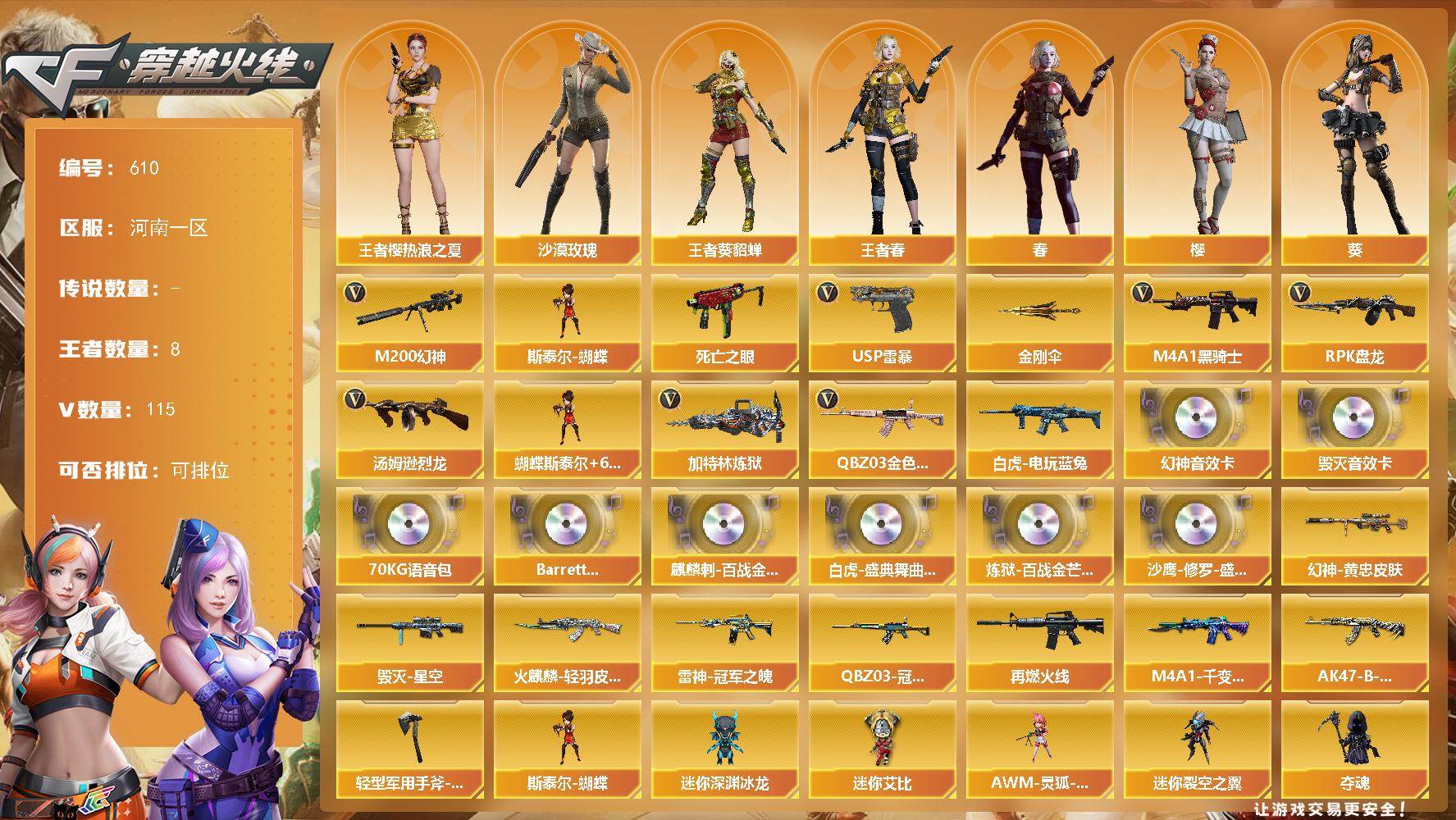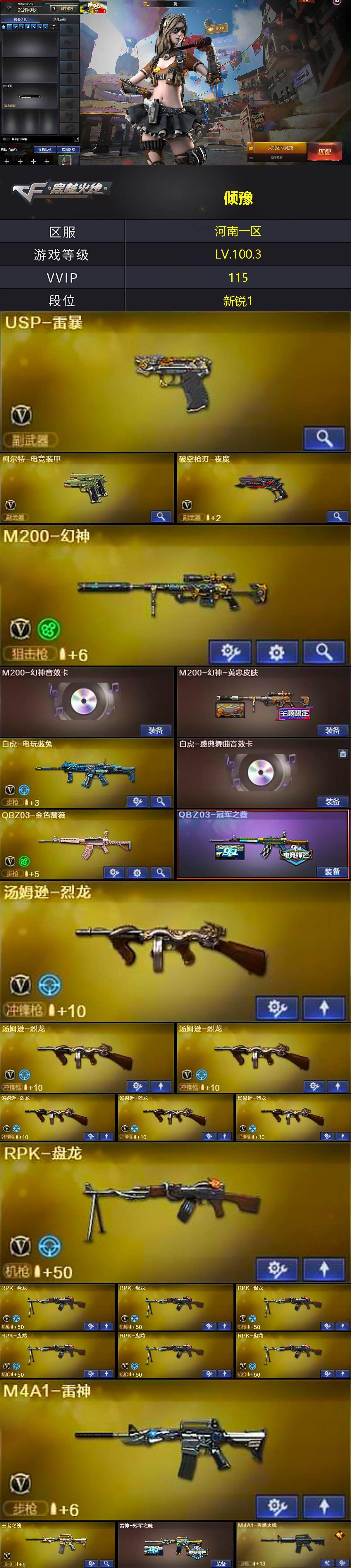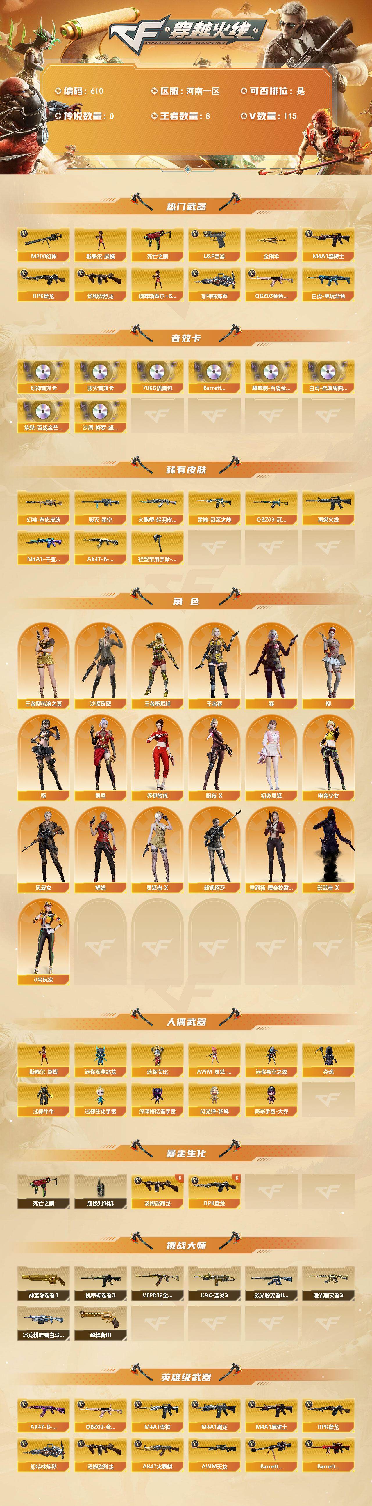 [13544451]河南一区-115V-8王者-0炫金 【热门武器】:QBZ03-金色蔷薇,M200-幻神,死亡之眼,白虎-电玩蓝兔,M4A1-黑骑士,汤姆逊-烈龙*6,RPK-盘龙*7,加特林-炼狱*3,斯泰尔-蝴蝶,USP-雷暴,金刚伞 【音效卡】:M200-幻神音效卡,Barrett-毁灭音效卡,70KG语音包,Barrett-碧霄极光音效卡,麒麟刺-百战金芒-盛典舞曲音效卡,白虎-盛典舞曲音效卡,炼狱-百战金芒-庆典舞曲音效卡,沙鹰-修罗-盛典舞曲音效卡 【皮肤】:M200-幻神-黄忠皮肤,QBZ03-冠军之薇,雷神-冠军之魄,M4A1-再燃火线,火麒麟-轻羽皮肤,毁灭-星空,M4A1-千变-孔明皮肤,AK47-B-常胜将军-刘备*2,轻型军用手斧-再燃火线 【角色】:葵,樱,春,沙漠玫瑰,王者樱-热浪之夏,王者-葵-貂蝉,王者春,乔伊教练,暗夜-X,初恋灵狐,电竞少女,风暴女*2,娟娟,0号玩家,灵狐者-X,蜀雪,新娜塔莎,雪莉杨-摸金校尉,影武者-X 【人偶武器】:斯泰尔-蝴蝶,AWM-灵狐-15周年嘉年华,迷你深渊冰龙*3,迷你裂空之翼*8,夺魂,迷你牛牛*3,迷你生化手雷*3,深渊终结者手雷,闪光弹-貂蝉,高爆手雷-大乔,迷你艾比 【暴走生化】:死亡之眼,超级对讲机 【挑战大师】:神圣爆裂者III,冰龙粉碎者-白马银枪,激光毁灭者III-白马银枪*2,VEPR-12-金魔,激光毁灭者III,机甲撕裂者III,KAC-圣炎切割者III,阐释者III*2 【英雄级武器】:AK47-火麒麟,M4A1-黑龙,M4A1-雷神,M4A1-黑骑士,M4A1-龙血*18,AK47-雷暴,M4A1-夜魔,QBZ03-金色蔷薇,王者之魄-觉醒版,AK47-B-常胜将军,白虎-电玩蓝兔,AWM-天龙,Barrett-毁灭*2,Barrett-极光,M200-幻神,Barrett-朱雀,Barrett-电竞装甲,王者之力-觉醒版,RPK-盘龙*7,加特林-炼狱*3,炼狱-百战金芒,汤姆逊-烈龙*6,沙鹰-天神,USP-雷暴,柯尔特-电竞装甲,破空枪刃-夜魔,屠龙*2,龙啸*2,麒麟刺,尼泊尔-电竞装甲,斩神刀-雷暴,麒麟刺-百战金芒,王者之啸-觉醒版*2,王者之击-觉醒版,高爆手雷-雷暴*7,闪光弹-雷暴*7,烟雾弹-雷暴*7,Barrett-碧霄极光 【道具】:BS战队炫彩背包,CFS限定