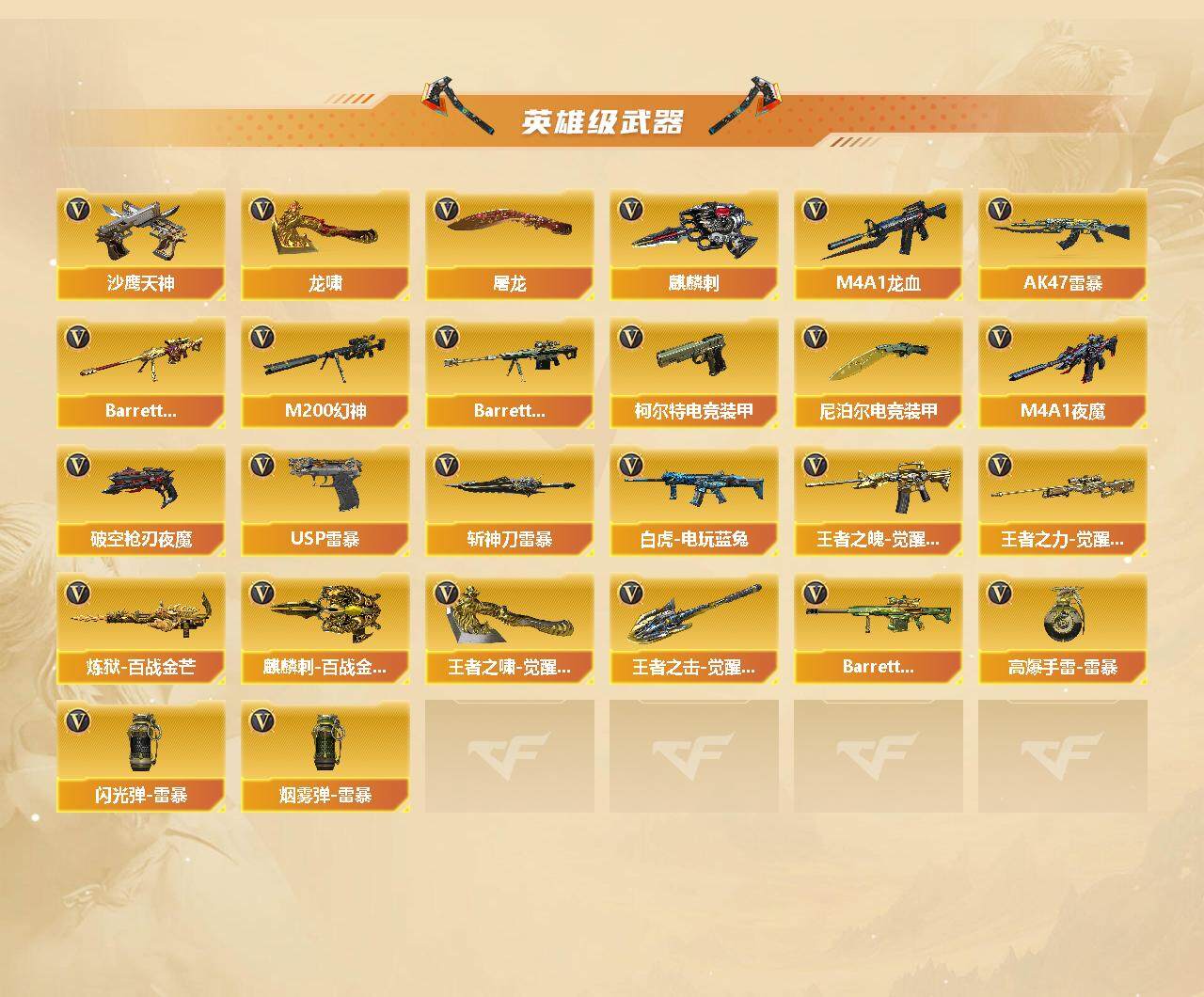 【英雄级武器】:AK47-火麒麟,M4A1-黑龙,M4A1-雷神,M4A1-黑骑士,M4A1-龙血*18,AK47-雷暴,M4A1-夜魔,QBZ03-金色蔷薇,王者之魄-觉醒版,AK47-B-常胜将军,白虎-电玩蓝兔,AWM-天龙,Barrett-毁灭*2,Barrett-极光,M200-幻神,Barrett-朱雀,Barrett-电竞装甲,王者之力-觉醒版,RPK-盘龙*7,加特林-炼狱*3,炼狱-百战金芒,汤姆逊-烈龙*6,沙鹰-天神,USP-雷暴,柯尔特-电竞装甲,破空枪刃-夜魔,屠龙*2,龙啸*2,麒麟刺,尼泊尔-电竞装甲,斩神刀-雷暴,麒麟刺-百战金芒,王者之啸-觉醒版*2,王者之击-觉醒版,高爆手雷-雷暴*7,闪光弹-雷暴*7,烟雾弹-雷暴*7,Barrett-碧霄极光