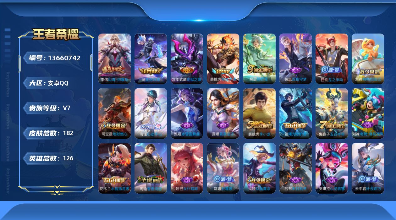 - PX_2095935-实名: 可修改 贵族等级: V5 英雄数: 124 皮肤数: 163 传说皮: 乘龙·问璇玑 限定皮: 李小龙,梁祝,御风骁将,引擎之心,飞衡,大圣娶亲,五谷丰年,山海·玄木吟,鸣野蒿,逐霄战戟