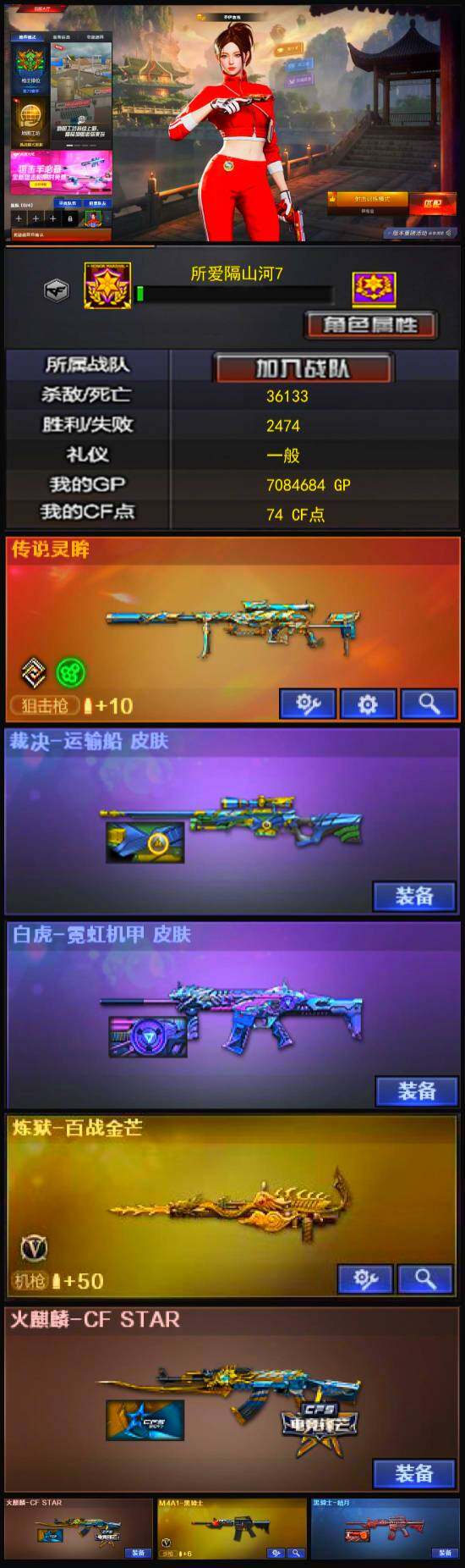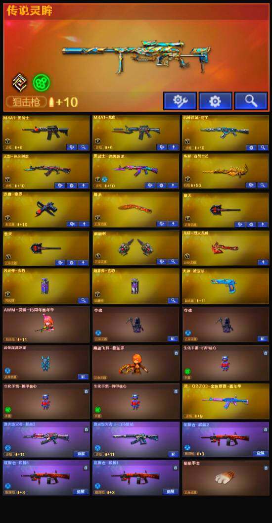 【英雄级武器】:M4A1-黑骑士,M4A1-龙血,无影-神兵利器,黑武士-锦绣游龙,炼狱-百战金芒,沙鹰-修罗,屠龙,擎天*2,麒麟刺,麒麟刺-百战金芒,闪光弹-玄豹,烟雾弹-玄豹
