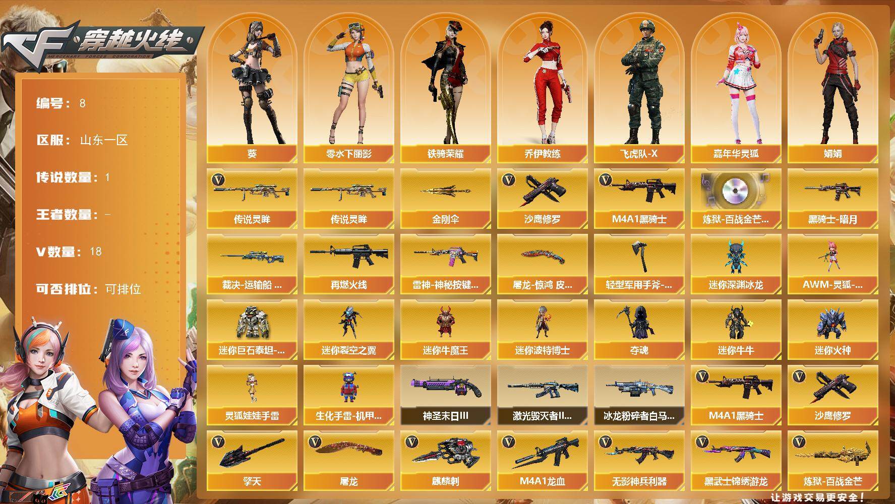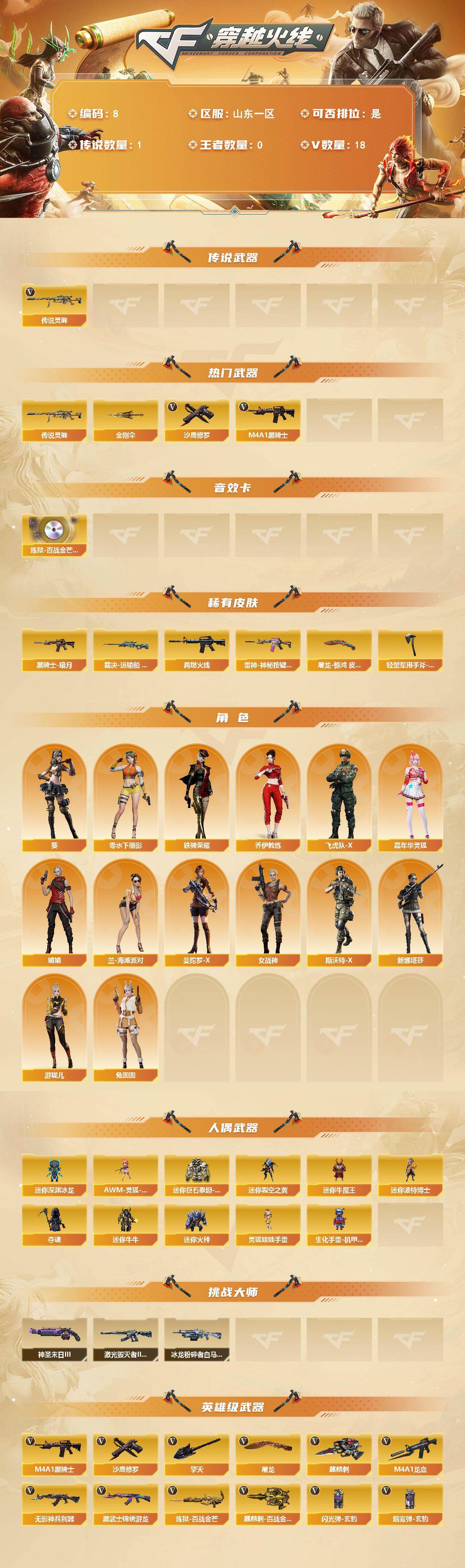 [13547511]山东一区-18V-0王者-0炫金 【传说武器】:传说灵眸 【热门武器】:传说灵眸,M4A1-黑骑士,沙鹰-修罗,金刚伞 【音效卡】:炼狱-百战金芒-庆典舞曲音效卡 【皮肤】:裁决-运输船 皮肤,M4A1-再燃火线,雷神-神秘按键 皮肤,黑骑士-暗月,屠龙-惊鸿 皮肤,轻型军用手斧-再燃火线 【角色】:葵,乔伊教练,飞虎队-X,嘉年华灵狐,娟娟,兰-海滩派对,零-水下丽影,曼陀罗-X,女战神,斯沃特-X,铁骑荣耀,兔囡囡,新娜塔莎,游珑儿 【人偶武器】:AWM-灵狐-15周年嘉年华,迷你深渊冰龙,迷你裂空之翼,迷你牛魔王,迷你波特博士*4,夺魂*2,迷你牛牛,迷你火种*2,生化手雷-机甲核心*3,迷你巨石泰坦-魔花研究所,灵狐娃娃手雷*2 【挑战大师】:冰龙粉碎者-白马银枪,激光毁灭者III-白马银枪,神圣爆裂者-末日III 【英雄级武器】:M4A1-黑骑士,M4A1-龙血,无影-神兵利器,黑武士-锦绣游龙,炼狱-百战金芒,沙鹰-修罗,屠龙,擎天*2,麒麟刺,麒麟刺-百战金芒,闪光弹-玄豹,烟雾弹-玄豹 【道具】:BS战队炫彩背包,冰冰企鹅背包,百战金芒炫彩背包,背包-洛丽塔,女皇终结者-魔龙之吻,救世主-黑桃战神,绿色巨人,灵魂忍者*2,变异宝贝,迷雾幽灵*2,生化弹匣,夺命之镰,防化服*3,金色流光-枪王排位*2,星辰流光-枪王排位,枪王排位28赛季金色流光,语音特效-盛典烟火,萌萌小葵表情,防弹头盔*5,防弹衣*5,C4工具钳*5,手雷包*5 【特殊枪械】:1黑骑士