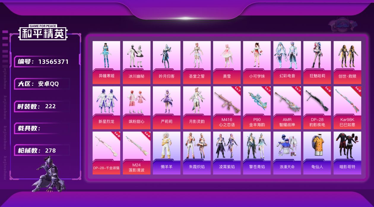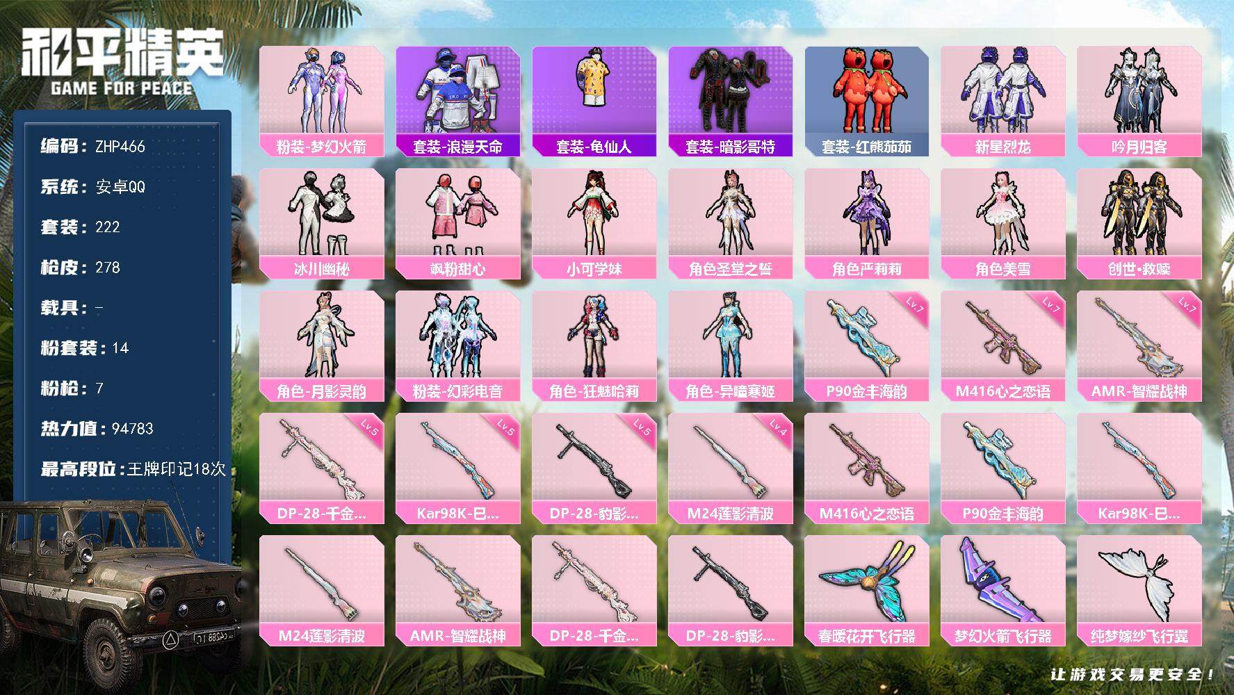[13565371]【店主推荐捡漏号!可直接换绑】/素材身法号 安卓 手Q-14粉装-7特效枪-0载具-8粉色飞行器-9.4w热力值-18王牌印记-222套装-278枪皮【热门品类】:粉装-梦幻火箭,套装-浪漫天命,套装-龟仙人,套装-暗影哥特,套装-红熊茄茄【粉色套装】:粉装-梦幻火箭,粉装-新星烈龙,粉装-吟月归客,粉装-冰川幽秘,粉装-飒粉甜心,角色-小可学妹,角色-圣堂之誓,角色-严莉莉,角色-美雪,套装-创世·救赎,角色-月影灵韵,粉装-幻彩电音,角色-狂魅哈莉,角色-异瞳寒姬【粉色枪皮等级】:M416-心之恋语(七级),P90-金丰海韵(七级),Kar98K-巳巳如意(五级),M24-莲影清波(四级),AMR-智耀战神(七级),DP-28-千金淑猫(五级),DP-28-豹影疾电(五级)【粉色飞行器】:春暖花开飞行器,梦幻火箭飞行器,纯梦嫁纱飞行翼,萌物绒绒飞行器,祥瑞锦鲤飞行器,曦光华影飞行器