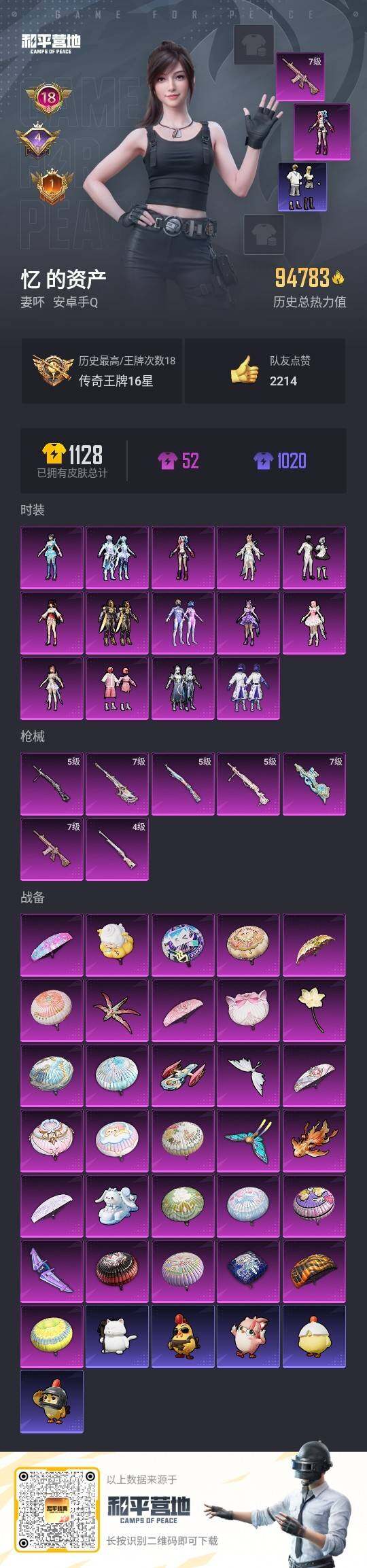 - PX_2094474- 安卓手Q-10王牌印记-有战神框-10粉装-6特效枪-0载具-56775热力值-109套装-153枪皮-3卓越印记-2传奇印记 【10粉装】,甜心巧克力,宝贝奶油派,天使彩虹糖,千面幻镜,放客神游,怪诞乔克,幻彩电音,光极星,岚岚物语,金丰海韵 【6特效枪】SCAR-L-纯梦嫁纱-7级 M416-女娲灵识-6级 Kar98K-巳巳如意-5级 Kar98K-圣域龙灵-3级 U