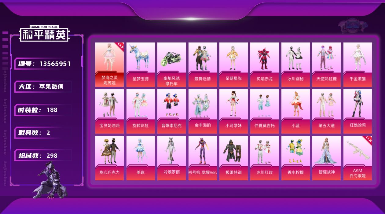 [13565951]5级妮芮妲!【红装碎片1306】小丑女觉醒螳螂!苹果 微信-1神装-24粉装-13特效枪-2载具-15粉色飞行器-123471热力值-11王牌印记-188套装-298枪皮
