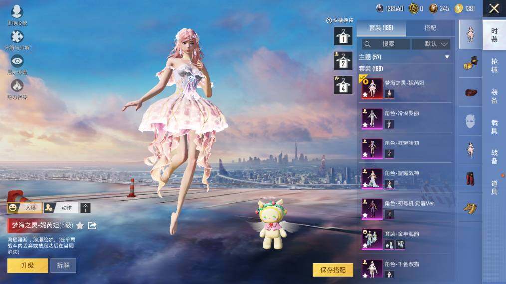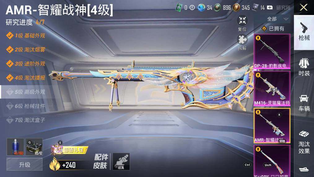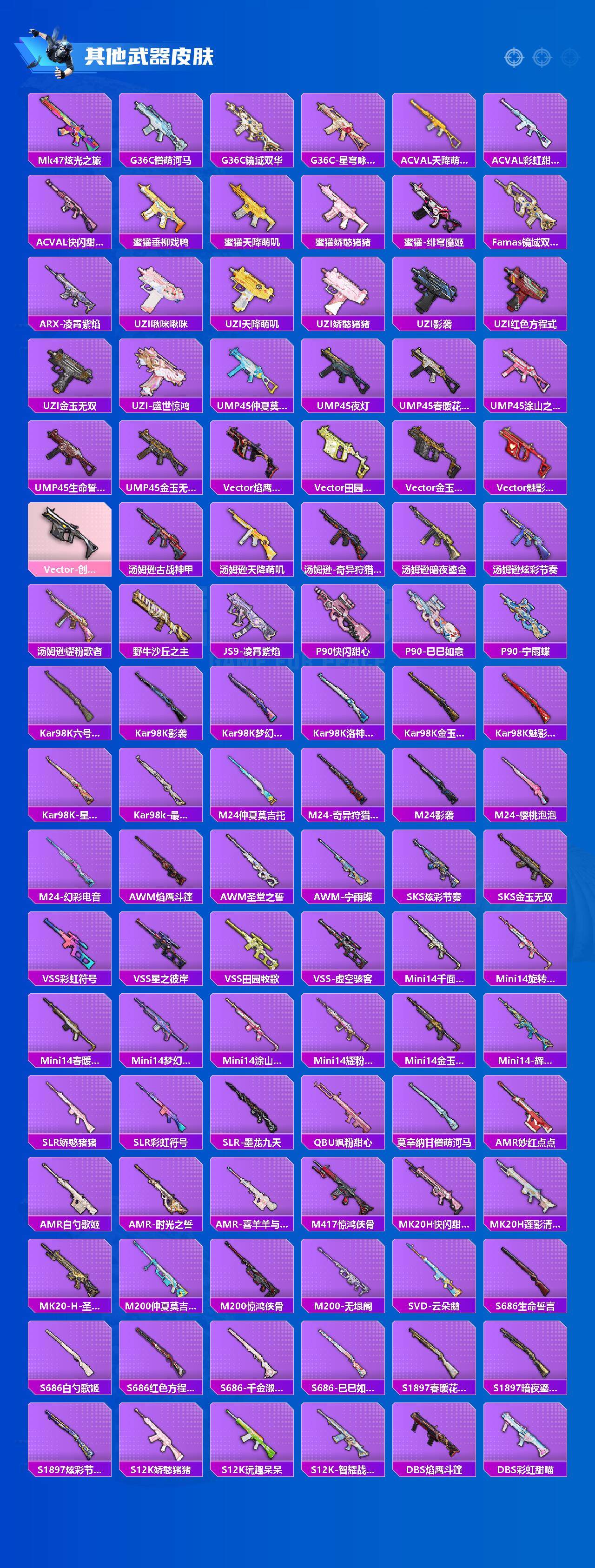 AKM-白勺歌姬,SCAR-L-纯梦嫁纱,M416-墨龙九天,GROZA-巴啦啦小魔仙,GROZA-精灵之光,P90-沙丘之主,Kar98K-巳巳如意,M24-镜域双华,SLR-暗夜玫瑰,PKM-江南烟雨