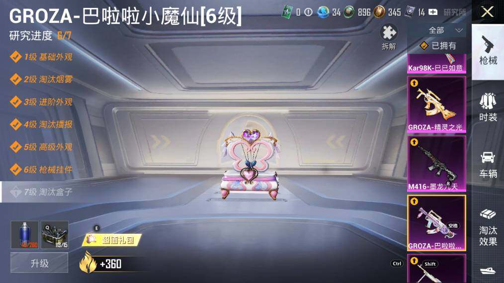 【粉色枪皮等级】:AKM-白勺歌姬(六级),SCAR-L-纯梦嫁纱(六级),M416-墨龙九天(一级),M416-灵猫魔法师(三级),GROZA-巴啦啦小魔仙(六级),GROZA-精灵之光(一级),P90-沙丘之主(三级),Kar98K-巳巳如意(五级),M24-镜域双华(二级),SLR-暗夜玫瑰(一级),AMR-智耀战神(四级),DP-28-豹影疾电(五级),PKM-江南烟雨(四级)