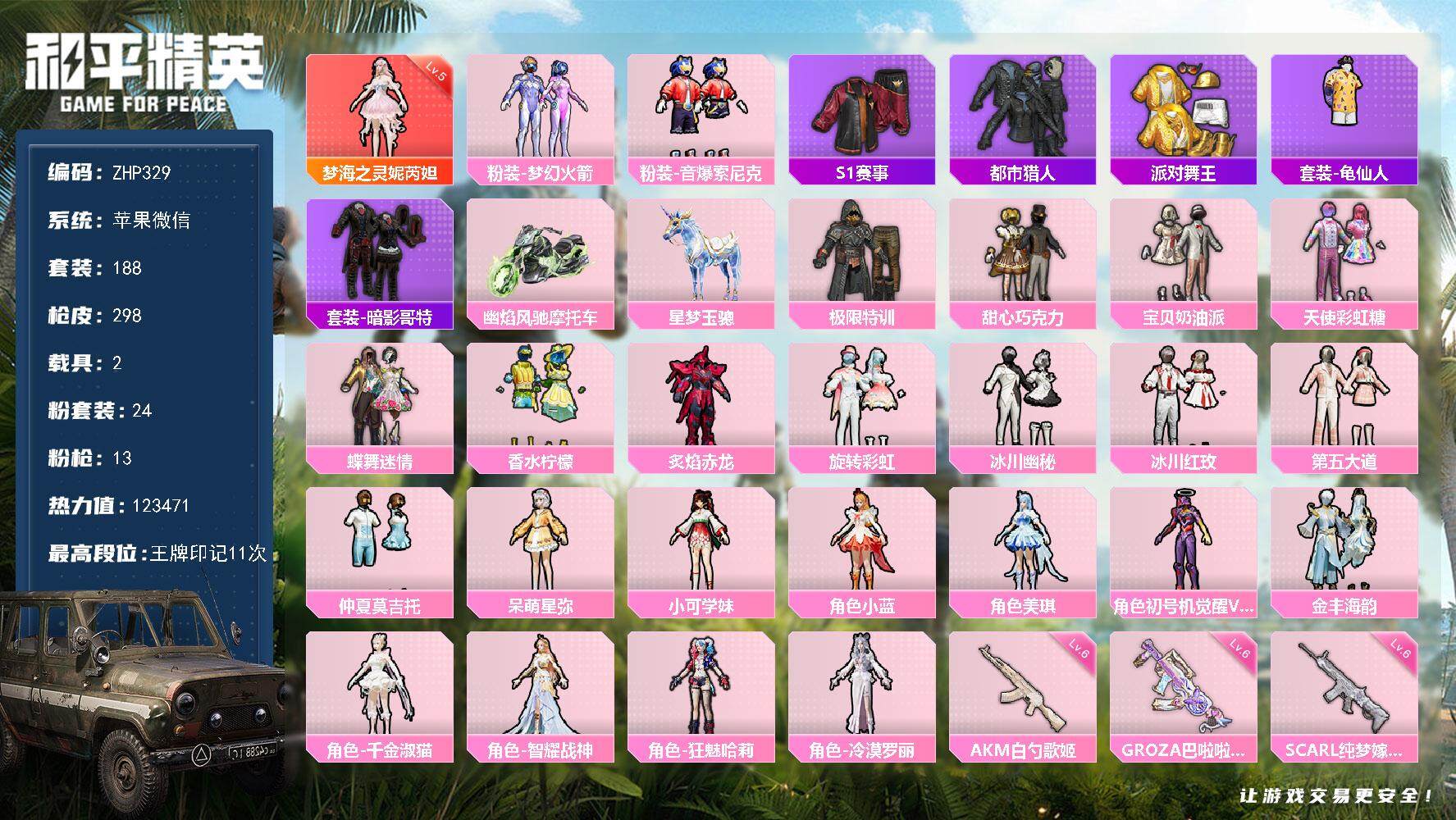 [13565951]5级妮芮妲!【红装碎片1306】小丑女觉醒螳螂!苹果 微信-1神装-24粉装-13特效枪-2载具-15粉色飞行器-123471热力值-11王牌印记-188套装-298枪皮 【红色神装等级】:梦海之灵-妮芮妲(五级) 【红色角色神装】:梦海之灵-妮芮妲 【热门品类】:粉装-梦幻火箭,粉装-音爆索尼克,套装-S1赛事,套装-都市猎人,套装-派对舞王,套装-龟仙人,套装-暗影哥特 【粉色载具】:幽焰风驰摩托车,星梦玉骢 【粉色套装】:粉装-极限特训,粉装-甜心巧克力,粉装-宝贝奶油派,粉装-天使彩虹糖,粉装-蝶舞迷情,粉装-梦幻火箭,粉装-香水柠檬,粉装-炙焰赤龙,粉装-旋转彩虹,粉装-冰川幽秘,粉装-冰川红玫,粉装-音爆索尼克,粉装-第五大道,粉装-仲夏莫吉托,角色-呆萌星弥,角色-小可学妹,角色-小蓝,角色-美琪,角色-初号机 觉醒Ver.,粉装-金丰海韵,角色-千金淑猫,角色-智耀战神,角色-狂魅哈莉,角色-冷漠罗丽 【粉色枪皮等级】:AKM-白勺歌姬(六级),SCAR-L-纯梦嫁纱(六级),M416-墨龙九天(一级),M416-灵猫魔法师(三级),GROZA-巴啦啦小魔仙(六级),GROZA-精灵之光(一级),P90-沙丘之主(三级),Kar98K-巳巳如意(五级),M24-镜域双华(二级),SLR-暗夜玫瑰(一级),AMR-智耀战神(四级),DP-28-豹影疾电(五级),PKM-江南烟雨(四级) 【粉色枪皮】:AKM-白勺歌姬,SCAR-L-纯梦嫁纱,M416-墨龙九天,M416-灵猫魔法师,GROZA-巴啦啦小魔仙,GROZA-精灵之光,P90-沙丘之主,Kar98K-巳巳如意,M24-镜域双华,SLR-暗夜玫瑰,AMR-智耀战神,DP-28-豹影疾电,PKM-江南烟雨 【粉色飞行器】:酣梦熊熊飞行器,春暖花开飞行器,千面幻镜飞行器,镜光幻境飞行翼,夜幕颂歌飞行器,沙丘之主天马,繁龙极客飞行器,镜域双华-灵镜之阶,深渊漩涡飞行器,曦光华影飞行器,圣域金龙飞行器,雀灵庇佑飞行器,灵猫魔法师飞行器,飞天猪飞行器 【粉色降落伞】:极限特训降落伞,甜心宝贝降落伞,春暖花开降落伞,梦幻火箭降落伞,甜蜜誓约降落伞,垂柳戏鸭降落伞,彩虹甜喵降落伞,旋转彩虹降落伞,青空秋雨降落伞,暗夜鎏金降落伞,畅跳缤纷降落伞,第五大道降落伞,仲夏莫吉托降落伞,白勺歌姬降落伞,未来歌姬降落