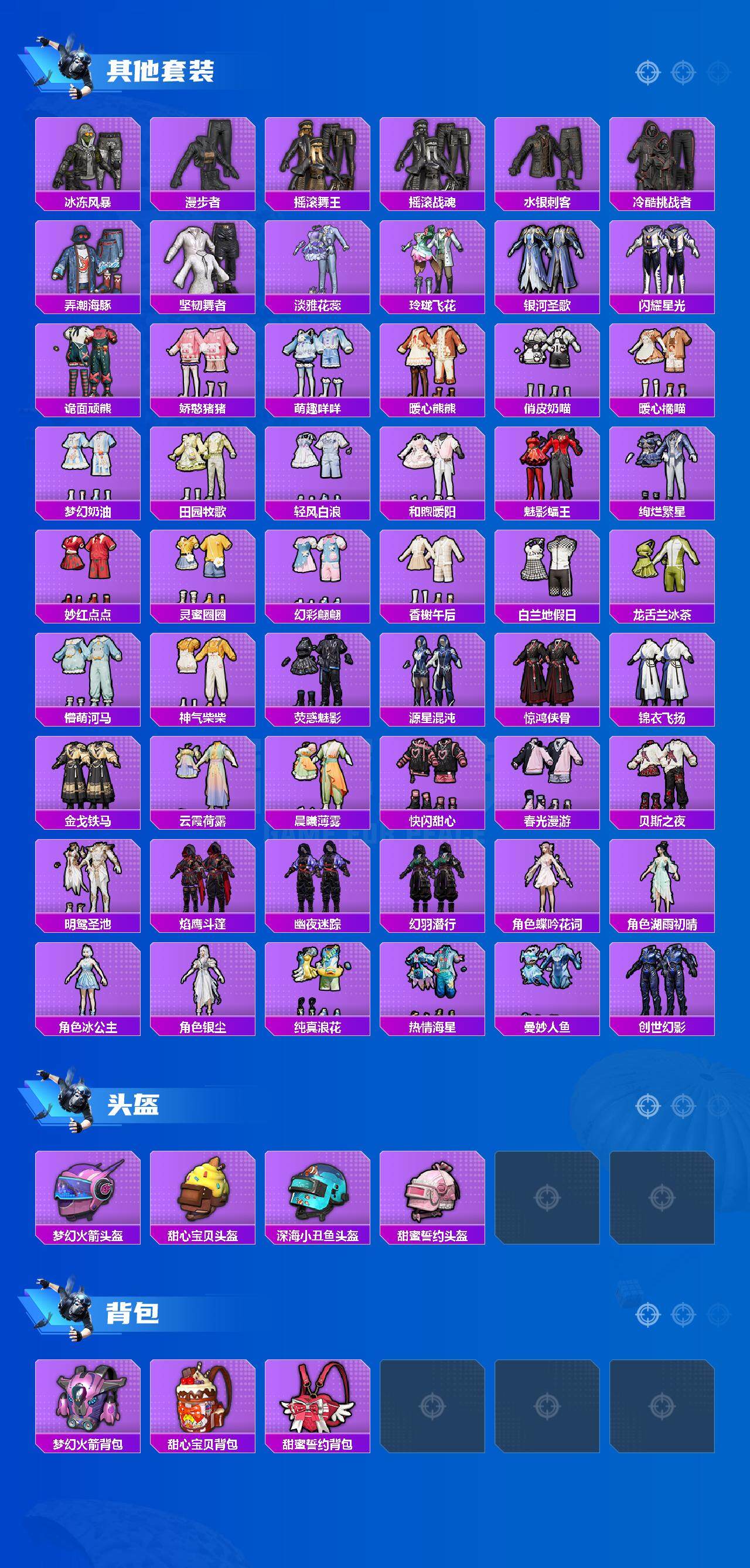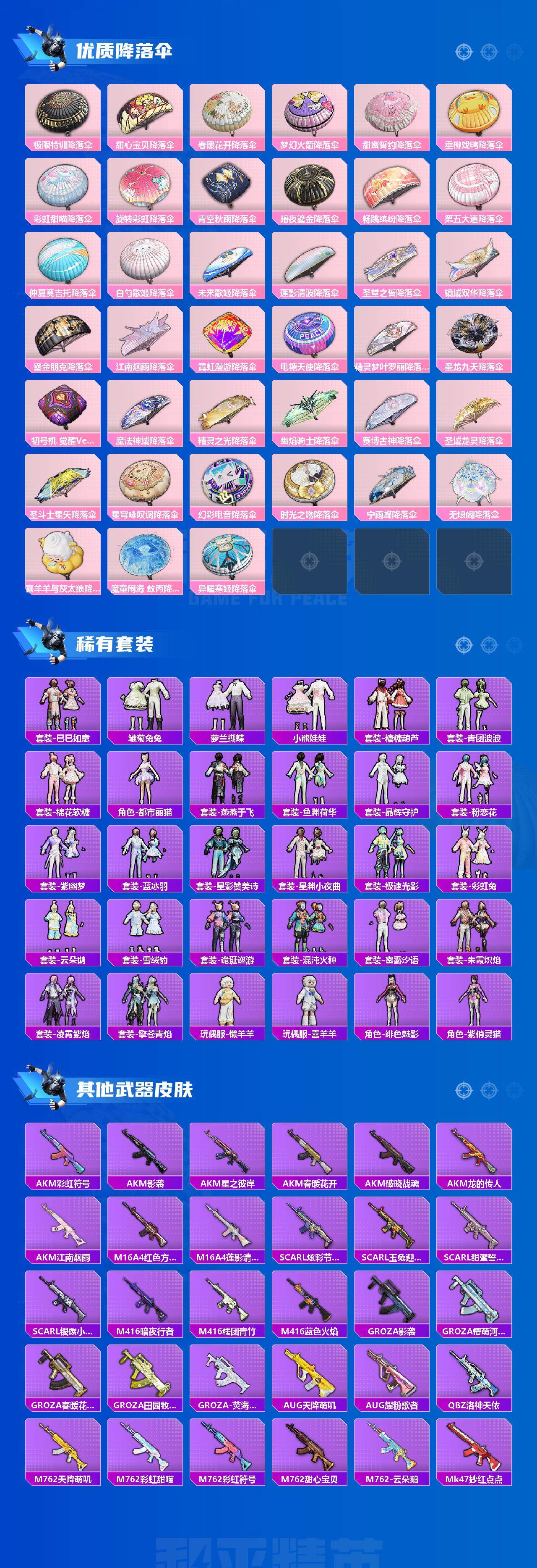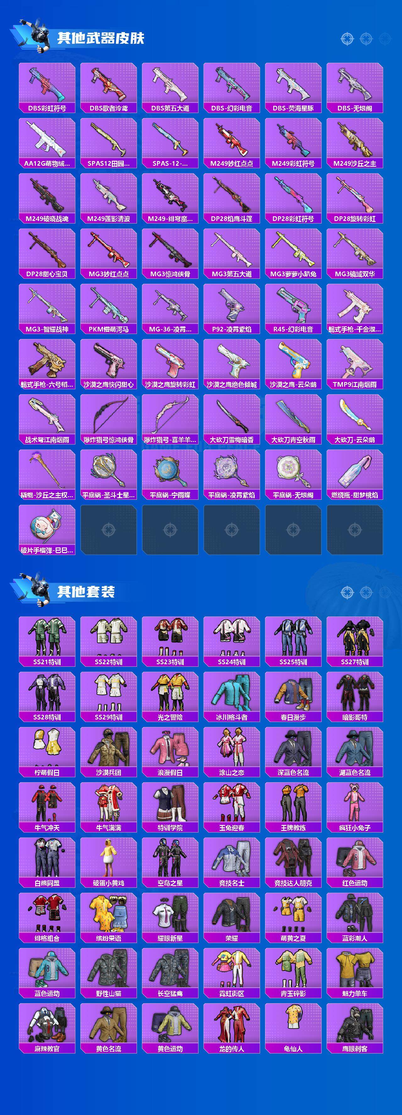 - [12294503]1粉装 1特效枪 可二次 可修改实名 优质装备:草莓生巧,Kar98K-巳巳如意 三级特效枪:三级Kar98K-巳巳如意 紫色装扮:SS23特训,SS31特训套装,SS21特训,SS22特训,北国孤狼,完美偶像,帅气教官,幻世战舞者,SS5特训,治愈之星,科技之星,SS14特训,黄色名流,青年教官,飞行日记,骑行爱好者,魅力单车,鹤鸣,麻辣教官,黄色伏地魔,黄色运动,黑色伏地魔,龙的传人,龟仙人,都市漫游者,都市魅力,酒红色名流,酷萌兔限定,野性战心,长空猛禽,阳光火鸡,雪山精英,街头潮人,深蓝色名流,湖蓝色名流,灰色格斗者,牛气冲天,牛气满满,活力之心,橘黑制服,竞技达人朋克,红色运动,绮丽涂鸦,缤纷果语,荣耀,蓝色运动,竞技勇士朋克,特战装甲,猎鹰,猛禽,甜蜜告白,疯狂小兔子,白色伏地魔,SS28特训,巳巳如意,烈火街头,智谋强哥,竞技名士,SS25特训,SS27特训,SS8特训,SS9特训,SS6特训,白虎圣者,原初圣火,逆风勇士,SS12特训,韶华初心,抹茶蜜豆,薄荷蓝莓,镭射皇者,银白舞王,SS13特训,SS11特训,SS10特训,深海来使,萌黄之夏 优质战备:仲夏莫吉托降落伞,夏日绵绵冰降落伞,飞行器-夏日绵绵冰,香水柠檬降落伞