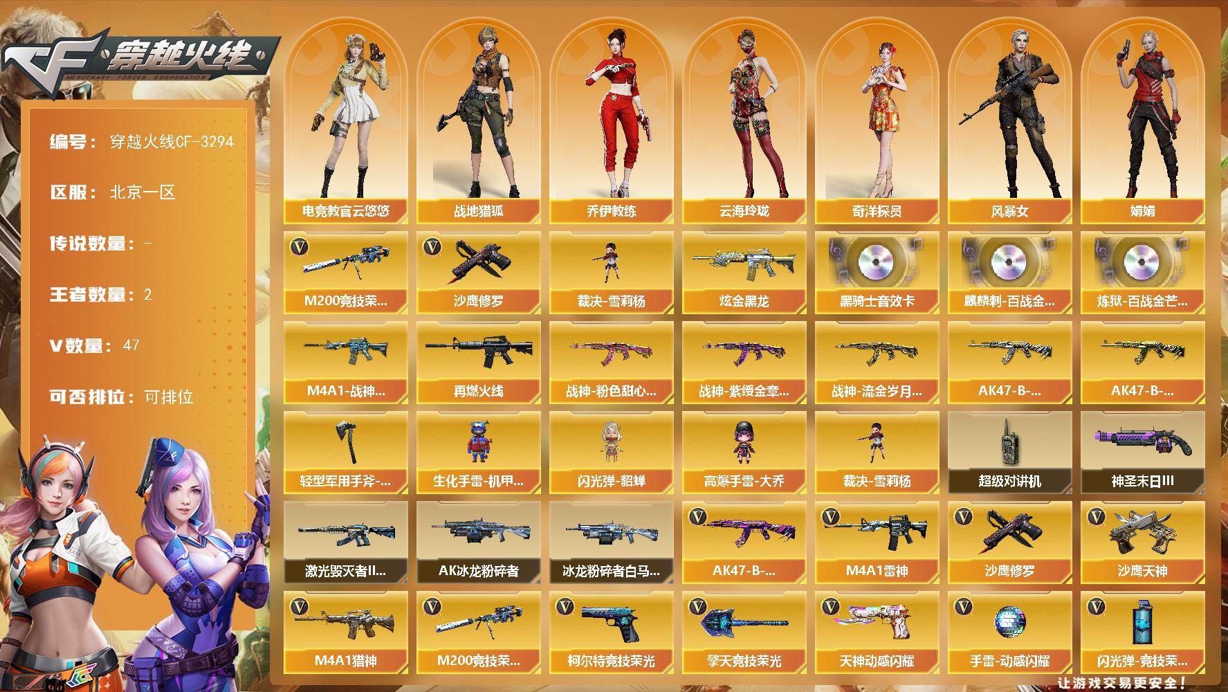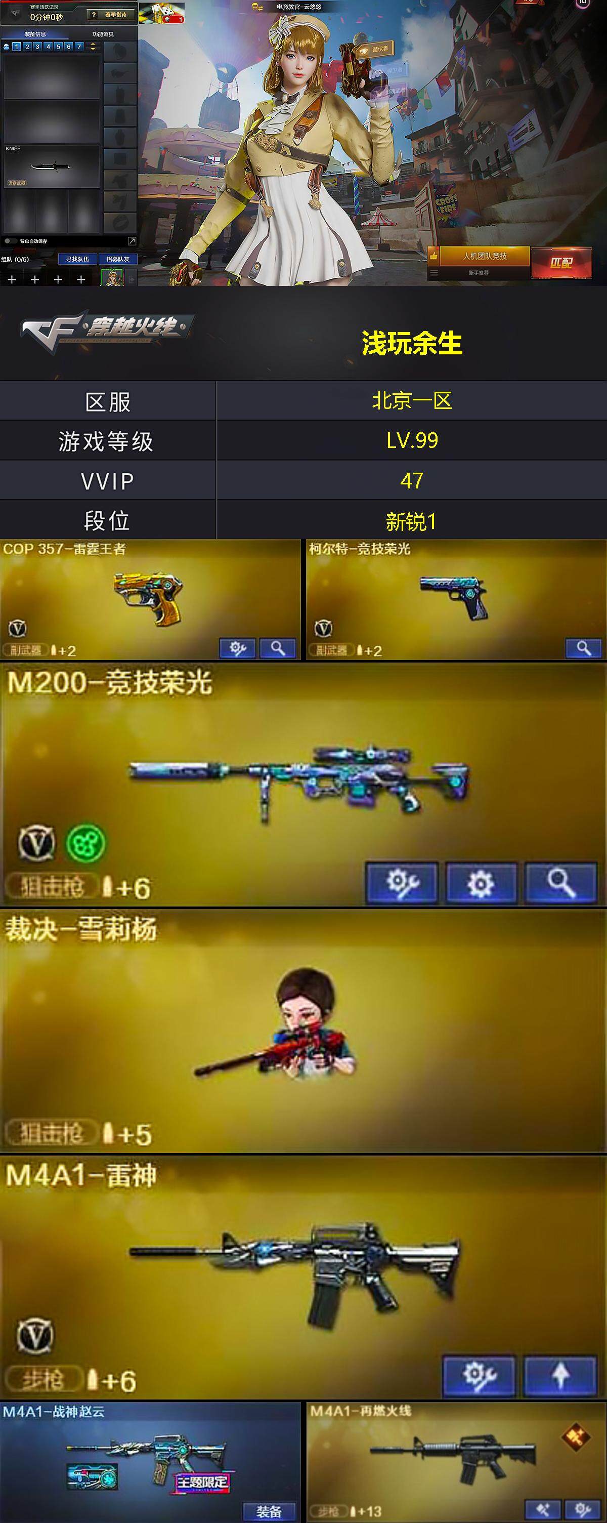 [13689172]北京一区-47V-2王者-1炫金 【热门武器】:M200-竞技荣光,裁决-雪莉杨,沙鹰-修罗 【王者炫金武器】:炫金黑龙 【音效卡】:M4A1-黑骑士音效卡,麒麟刺-百战金芒-盛典舞曲音效卡,炼狱-百战金芒-庆典舞曲音效卡 【皮肤】:M4A1-战神赵云,M4A1-再燃火线,战神-粉色甜心皮肤,战神-紫绶金章皮肤,战神-流金岁月皮肤,AK47-B-常胜将军-刘备,AK47-B-常胜将军-孙权*3,轻型军用手斧-再燃火线 【角色】:电竞教官-云悠悠,战地猎狐,奇洋探员,乔伊教练,云海玲珑,风暴女,娟娟,潘多拉-X 【人偶武器】:裁决-雪莉杨,生化手雷-机甲核心,闪光弹-貂蝉,高爆手雷-大乔 【暴走生化】:超级对讲机 【挑战大师】:AK47-冰龙粉碎者,冰龙粉碎者-白马银枪,激光毁灭者III-白马银枪,神圣爆裂者-末日III 【英雄级武器】:M4A1-雷神,M4A1-猎神,AK47-B-常胜将军,M200-竞技荣光,王者之力-觉醒版,炼狱-百战金芒,沙鹰-修罗,沙鹰-天神,COP 357-雷霆王者-觉醒版,柯尔特-竞技荣光,天神-动感闪耀,擎天-竞技荣光*2,麒麟刺-百战金芒,高爆手雷-竞技荣光*8,手雷-动感闪耀,闪光弹-竞技荣光*8,烟雾弹-竞技荣光*8,M4A1-赤狱骑士 【道具】:BS战队炫彩背包,云山科技背包,百战金芒炫彩背包,背包-洛丽塔,超级背包,女皇终结者-魔龙之吻,救世主-黑桃战神,黄金生化钩,绿色巨人,灵魂忍者,迷雾幽灵,夺命之镰,防化服*3,金色流光-枪王排位*2,星辰流光-枪王排位,流光-再燃火线,枪王排位29赛季金色流光,语音特效-盛典烟火,萌萌小葵表情,动感闪耀表情,防弹头盔*4,防弹衣*4,C4工具钳*5,手雷包*5 【特殊枪械】: