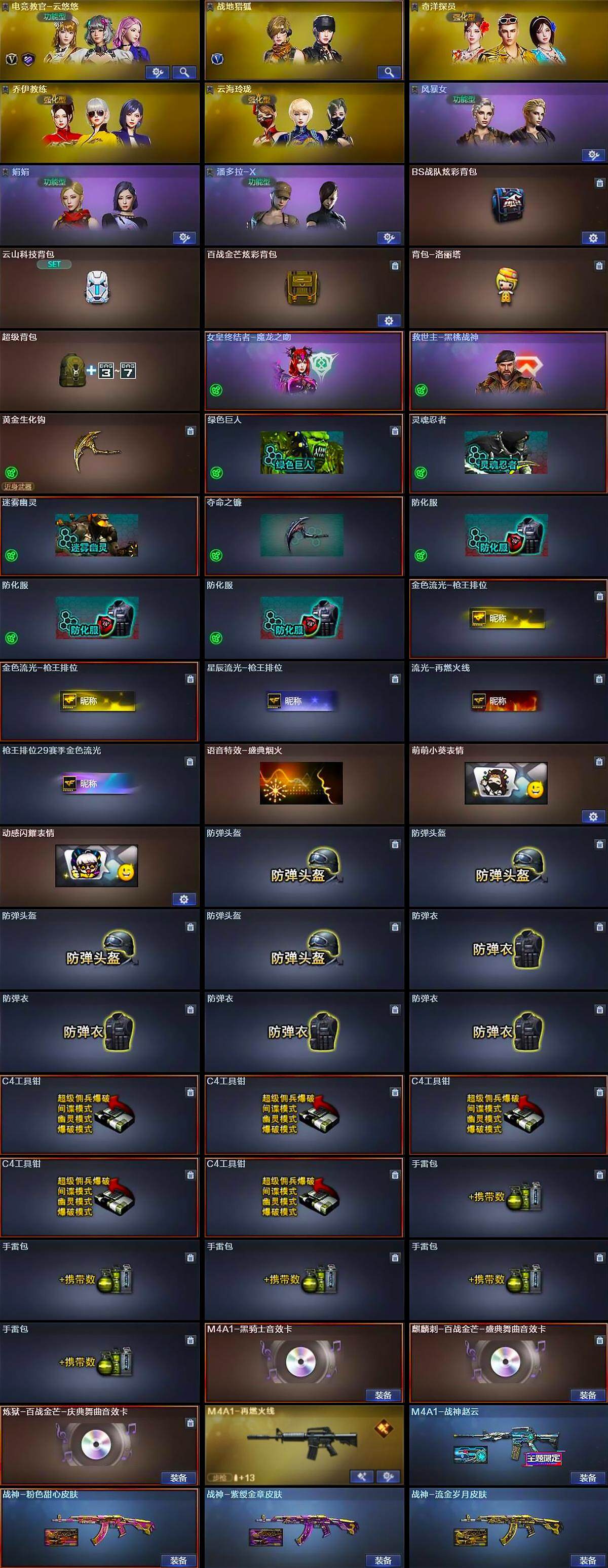 【道具】:BS战队炫彩背包,云山科技背包,百战金芒炫彩背包,背包-洛丽塔,超级背包,女皇终结者-魔龙之吻,救世主-黑桃战神,黄金生化钩,绿色巨人,灵魂忍者,迷雾幽灵,夺命之镰,防化服*3,金色流光-枪王排位*2,星辰流光-枪王排位,流光-再燃火线,枪王排位29赛季金色流光,语音特效-盛典烟火,萌萌小葵表情,动感闪耀表情,防弹头盔*4,防弹衣*4,C4工具钳*5,手雷包*5