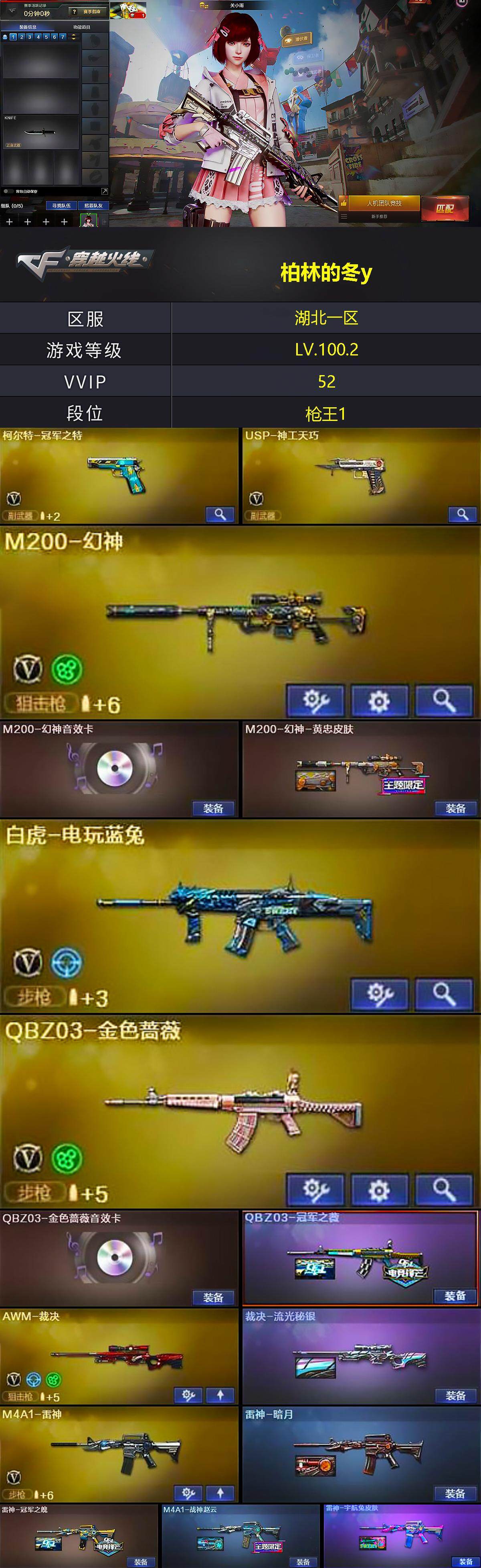 【热门武器】:QBZ03-金色蔷薇,M200-幻神,白虎-电玩蓝兔,柯尔特-冠军之特,M4A1-黑骑士,Knife-冠军之刃*2