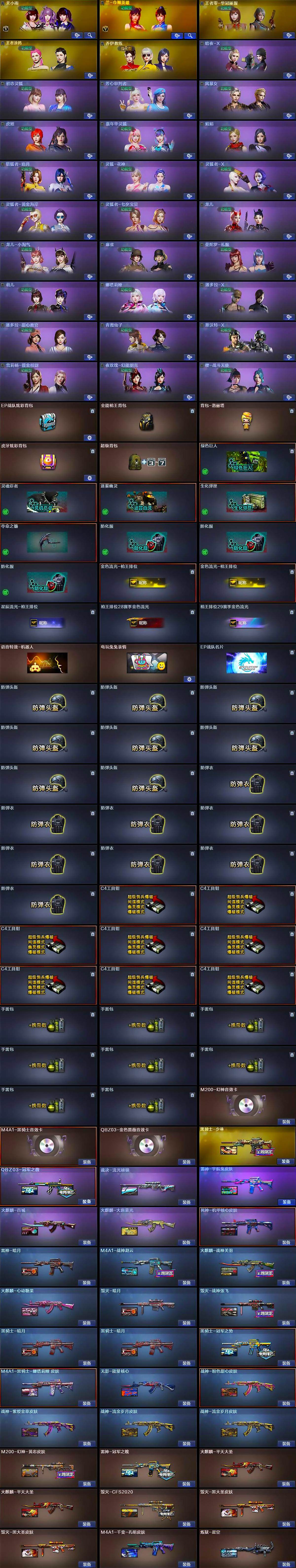 【皮肤】:M200-幻神-黄忠皮肤,QBZ03-冠军之薇,裁决-流光秘银,雷神-暗月,雷神-冠军之魄,M4A1-战神赵云,雷神-宇航兔皮肤,火麒麟-战神关羽,火麒麟-平天大圣*2,火麒麟-百城,火麒麟-大唐荣光,火麒麟-心动糖果,毁灭-暗月,毁灭-CFS2020,毁灭-战神张飞,毁灭-黑大圣皮肤*2,M4A1-千变-孔明皮肤,黑骑士-暗月*2,黑骑士-冠军之势,黑骑士-少林,M4A1-黑骑士-娜塔莉娅 皮肤,无影-能量核心,死神-机甲核心皮肤,战神-粉色甜心皮肤,战神-紫绶金章皮肤,战神-流金岁月皮肤*2,AK47-B-常胜将军-曹操,AK47-B-常胜将军-孙权,炼狱-星空